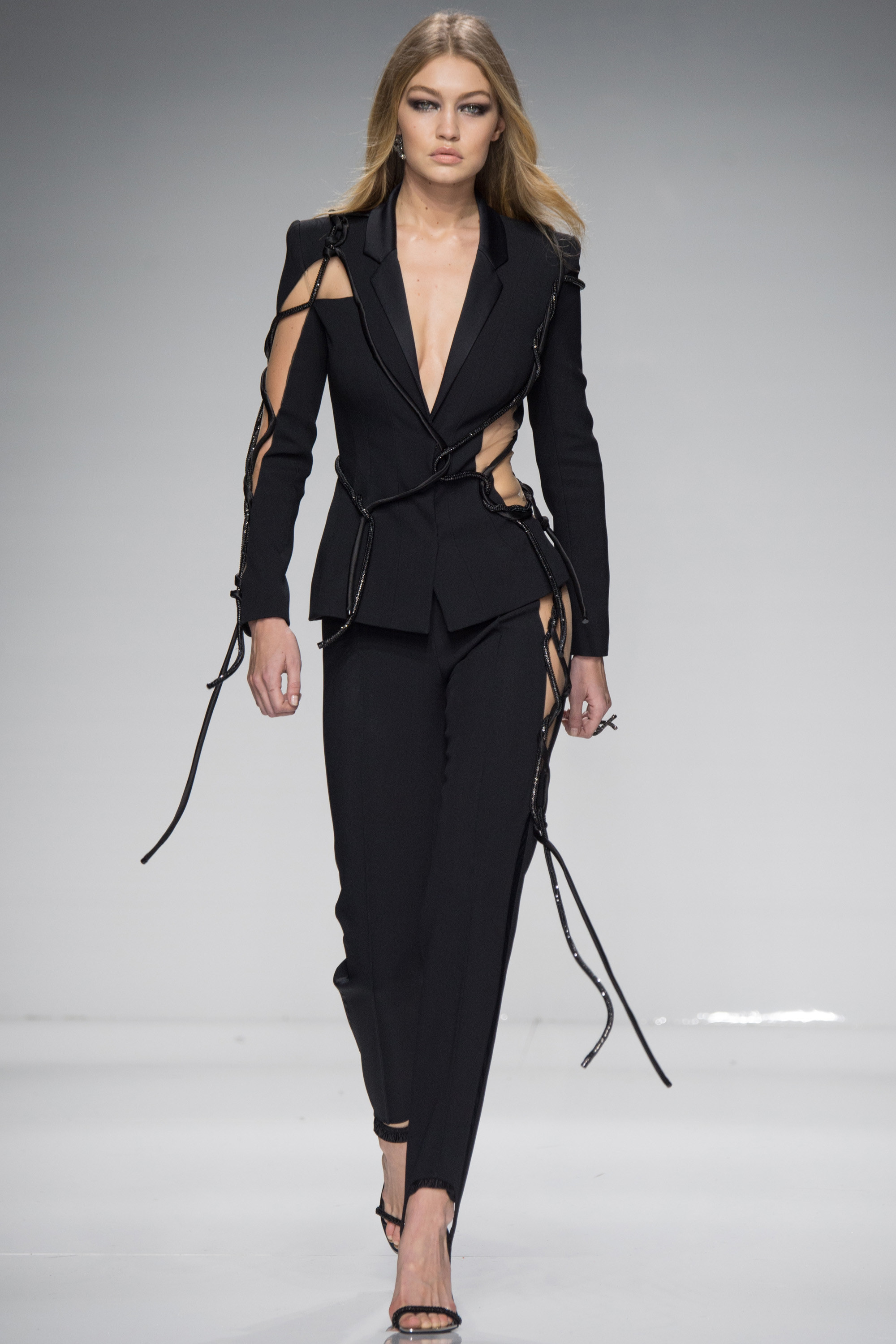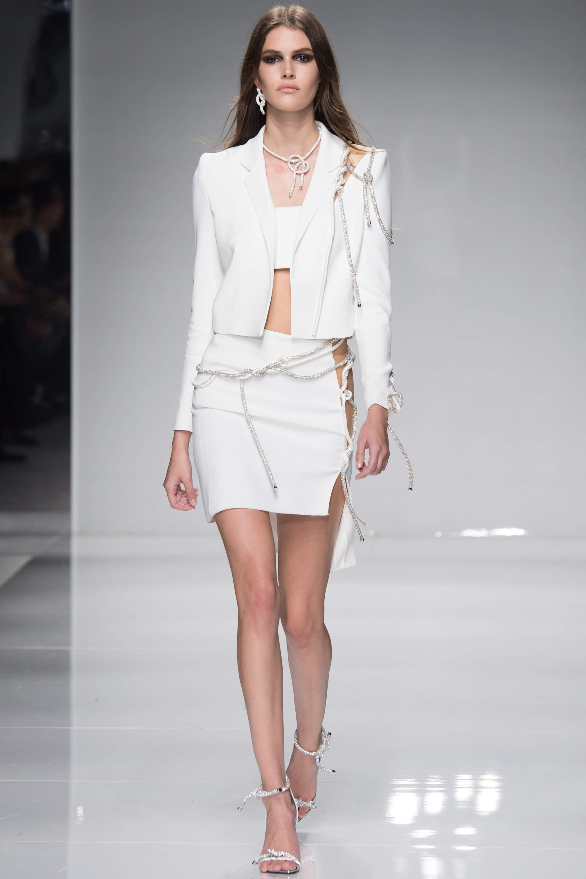 But let’s not fool ourselves: Versace was not straying from its signature aesthetic. Expertly-tailored power suits, deep-cut necklines, sultry slits, and flashes of flesh were on parade. Midriff-baring bandeaus, pencil skirts accented by thigh-high cuts, sheer sleeves, and poignant perfection were on the agenda out of the gate.