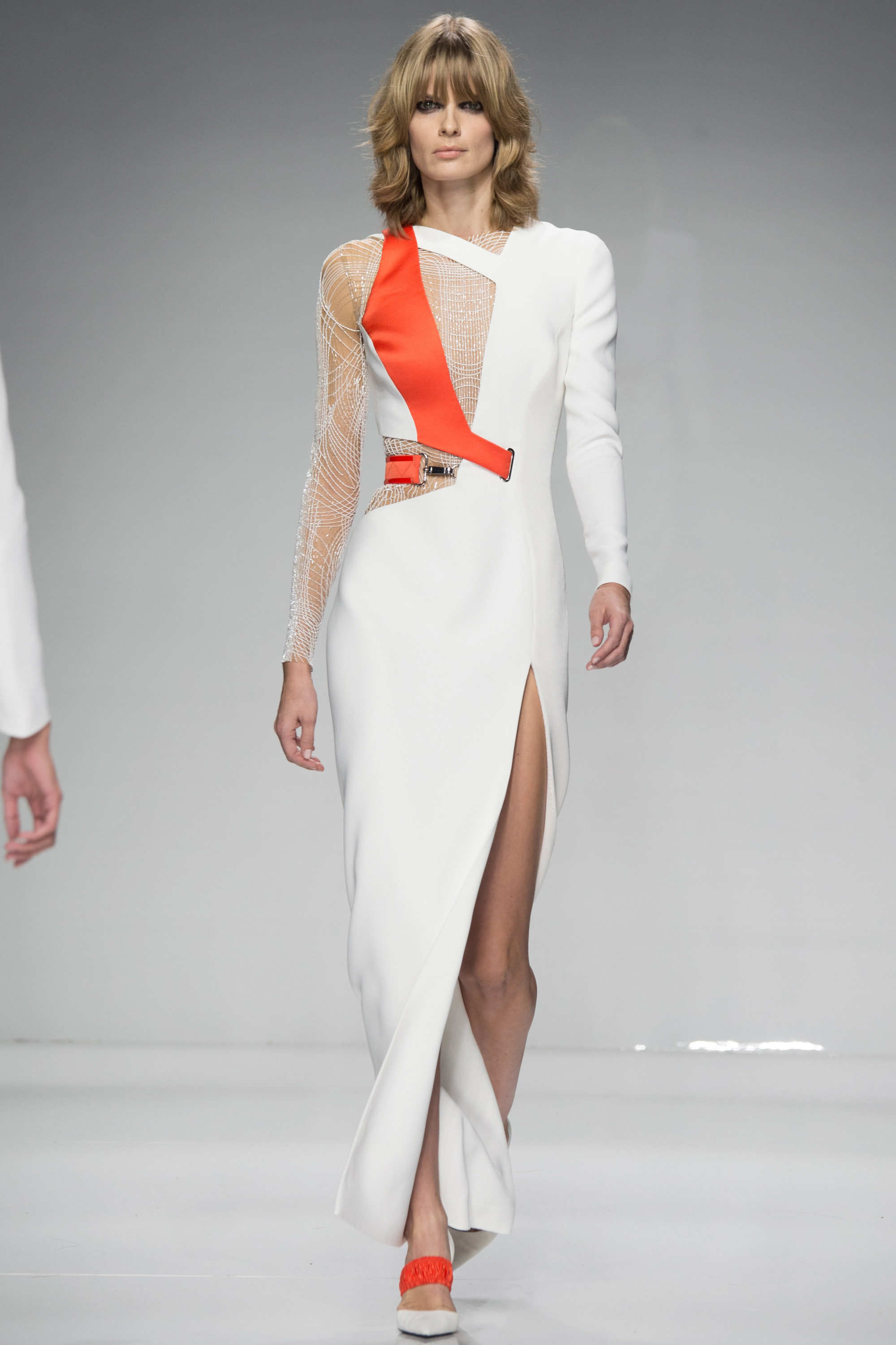 Couture calls for technicality and that was on high by way of colorful woven straps, sexy open knits, smoldering slits beset with sequin embellishment, and flesh-tone under layers giving the impression of almost complete nudity.