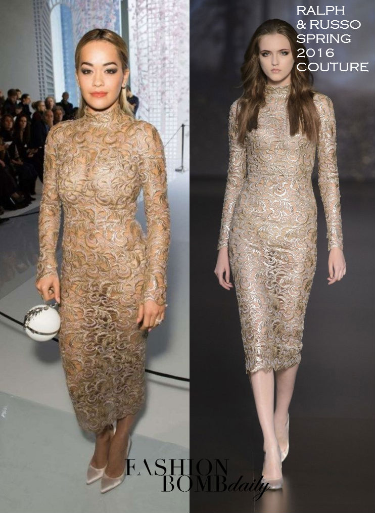 Rita Ora continued her Couture Fashion Week tour, this time hitting up the Ralph & Russo Spring 2016 show. Of course, she wore a piece from the brand, donning a long-sleeve flesh tone lace dress from the Fall 2015 Couture collection: