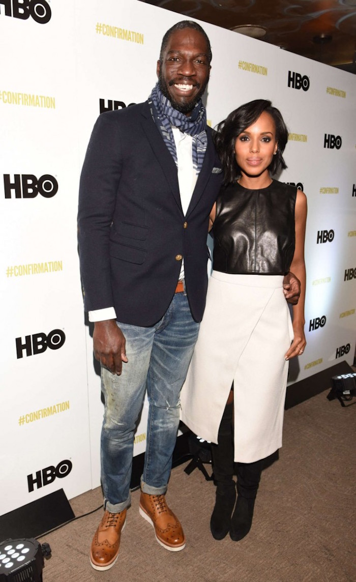 Kerry Washington attended HBO’s Confirmation premiere at the 2016 Sundance Film Festival outfitted in a Ji Oh Resort 2016 Black Leather Sleeveless Top, $425 Tibi White Wrap Front A-Line Skirt and $798 Stuart Weitzman Highland Suede Over The Knee Boots: