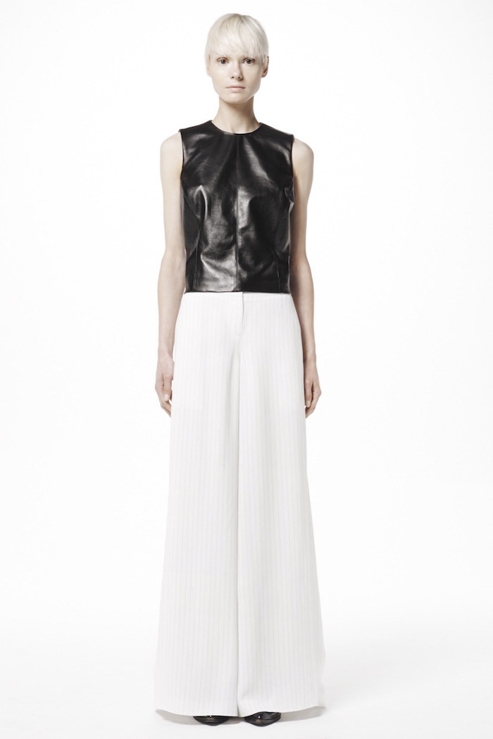 Her soon to be released sleek leather top was modeled with contrasting white wide leg trousers.