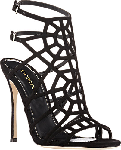 Her sultry heels feature a 4.25 inch heel, a leather sole and slim straps with geometric shapes.