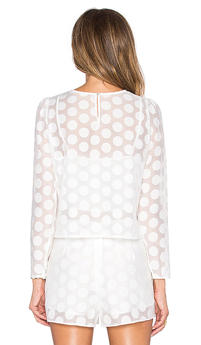 Cutie Sarah Hyland hit up the Minnie Mouse Rocks The Dots Art And Fashion Exhibit in a $99 Line & Dot Soleil Long Sleeve White Dot Blouse and $99 Shorts: