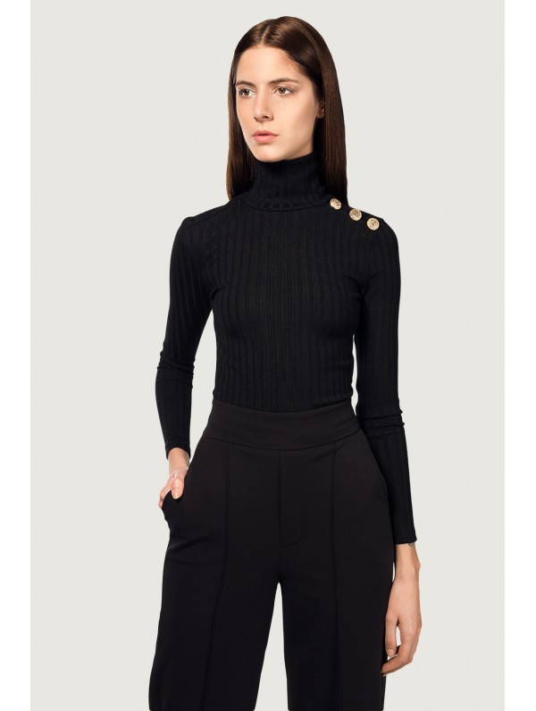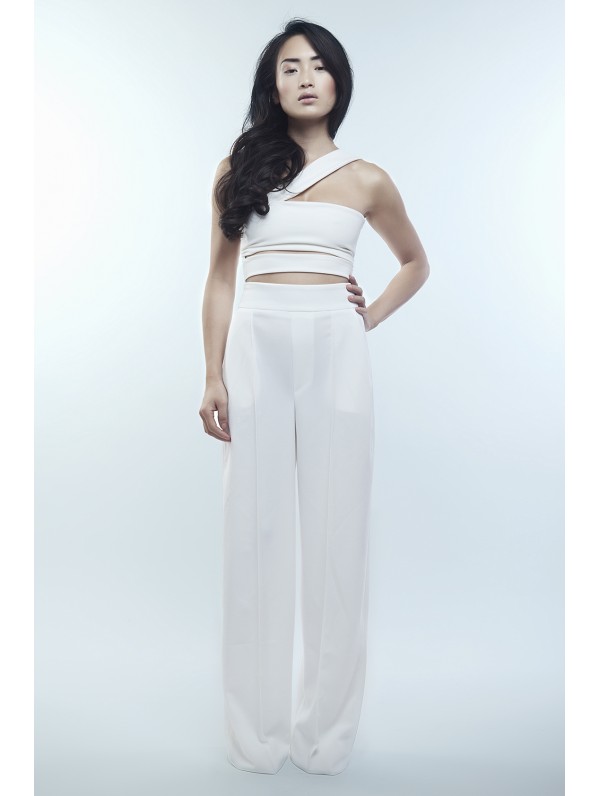 The flattering piece boasts a one shoulder design and ties at the neck.