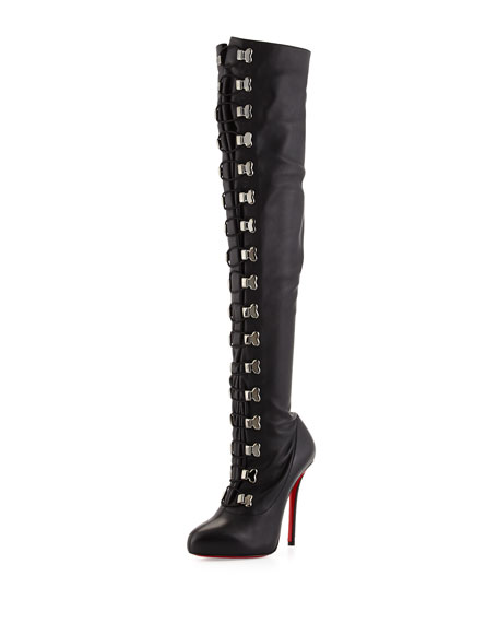 Her black leather over-the-knee boots feature an almond toe silhouette, stretch loop front, gunmetal hardware, and 4.8″ heels.