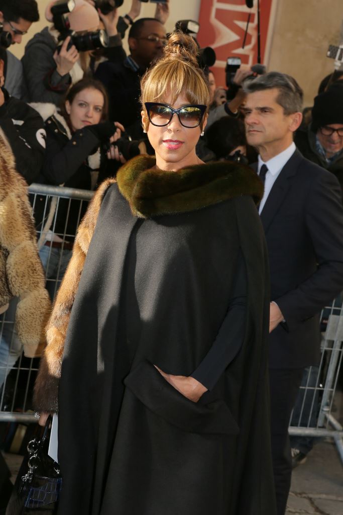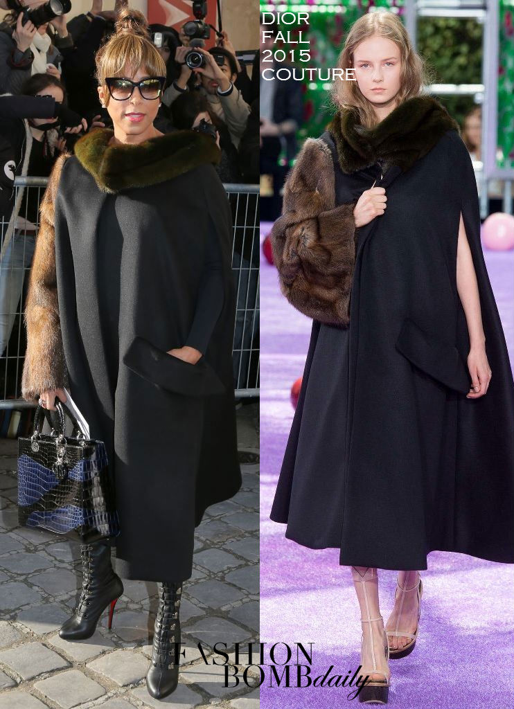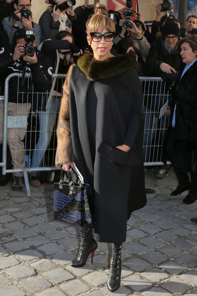 Marjorie Harvey loves couture, thus it was no surprise to see her at the Christian Dior Spring 2016 Couture Show. Naturally, she was clad in a Fall 2015 Couture Black Fur Collar and Asymmetric Sleeve Cape from the iconic French fashion house, a Blue and Cobalt Croc Lady Dior Bag, and Christian Louboutin Black Leather Top Croche Over the Knee Boots: