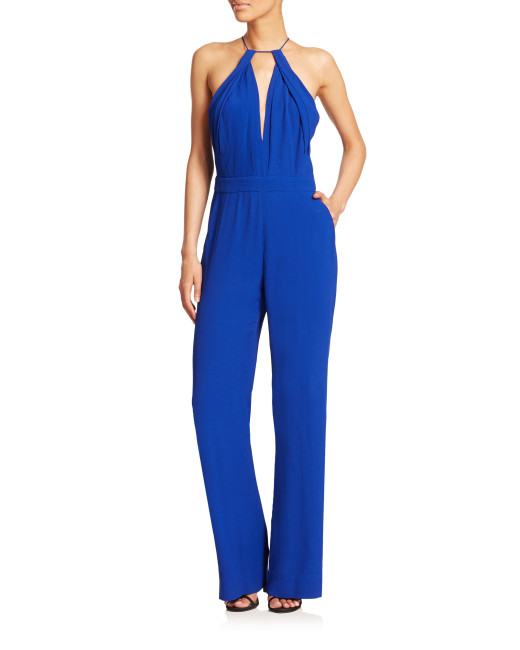 Her jumpsuit features a cutout back, a self-tie halter neckline, plunging v-neck, concealed side zip, banded waist, side slash pockets, a wide-leg silhouette.