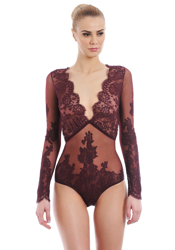 Her lace bodysuit features long sleeves, a deep v front, and scalloped edges.