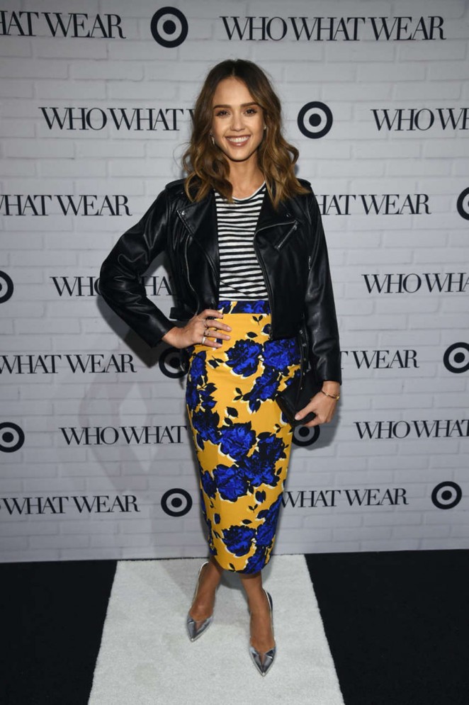 Jessica Alba was on hand at the Who What Wear x Target Launch Party! Naturally, she was clad in pieces from the collaboration in a $45 Black Minimal Moto Jacket, $23 Black and White Bateau Stripe Tee, and $28 Vintage Floral Pencil Skirt: