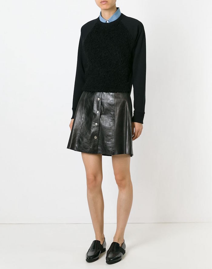 Her black buttoned skirt is crafted from leather and boasts an A-line silhouette.
