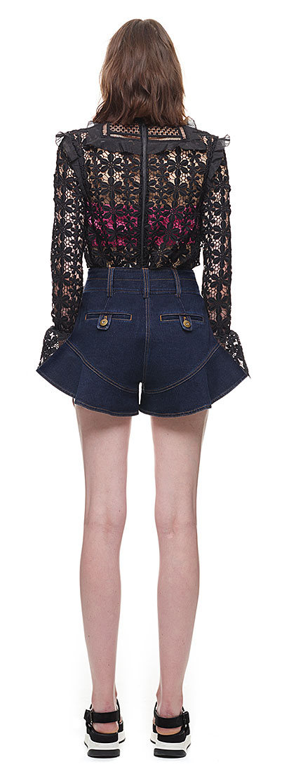This balloon sleeve top has a dot mesh bib with lace up detail and an organza bib frill.