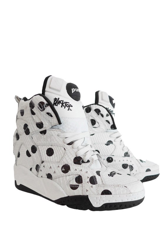 Her limited release high-tops are crafted from python embossed leather. They feature gel printed polka dots, four sets of laces with each pair, an embroidered toe bed that says “Make Love” on left and right shoe, and a signature set of eye lace locks.