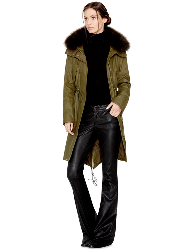 Her cotton-blend coat boasts fur detailing on the removable hood, front pockets, and a waist drawstring.