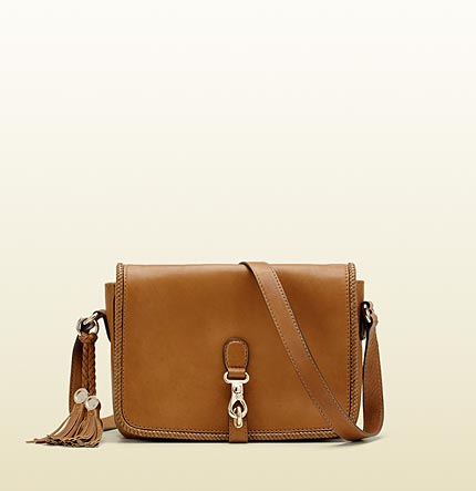 Her caramel leather shoulder bag features fine braided trim, pale-gold hardware, an adjustable leather shoulder strap, a latch fastening at its fold-over flap front, and braided tassels at the side with the iconic Italian fashion house’s stamped pale-gold details.