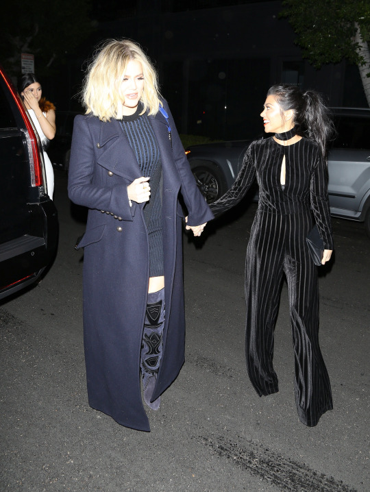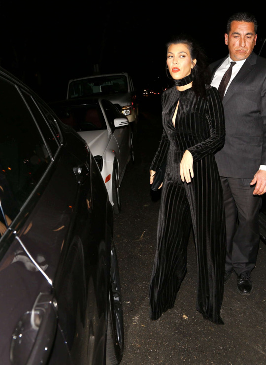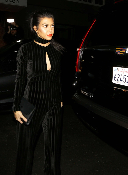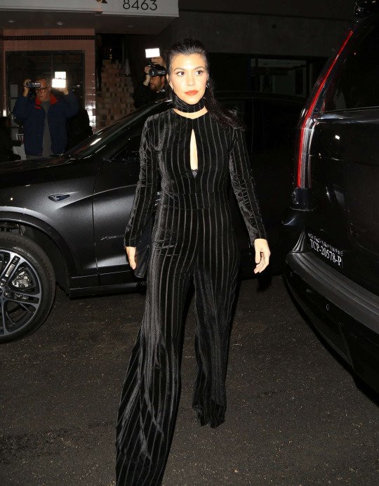 Kourtney Kardashian joined sisters Khloe and Kylie at Nine Zero One Salon in LA wearing a $119 La Femme Jumpsuit by Kyna Collection: