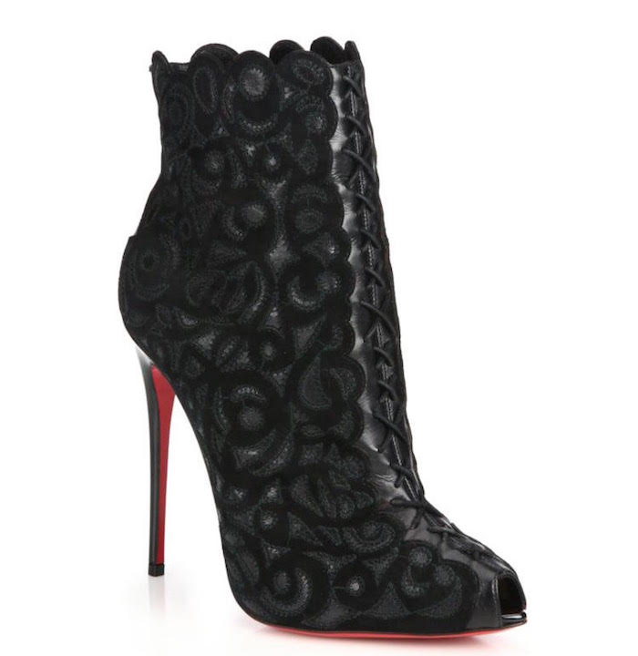 Her Italian made peep-toe stunners are intricately embroidered with decorative lace-up details and boast 4″ heels.