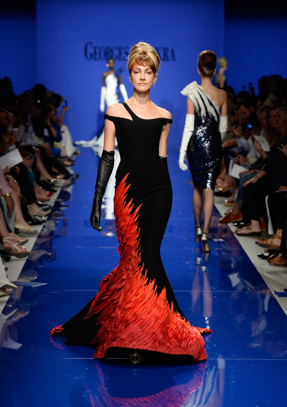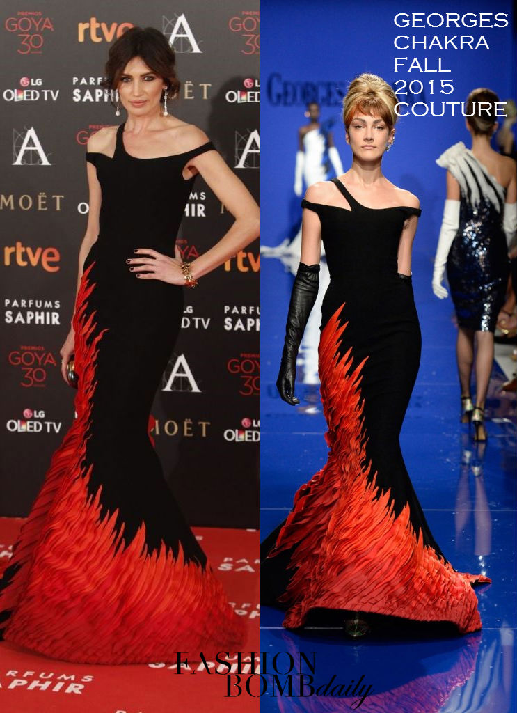 Nieves Alvarez sizzled at the 30th Annual Goya Film Awards in a Georges Chakra Fall 2015 Couture Black Off the Shoulder Ombre Flame Embroidered Gown: