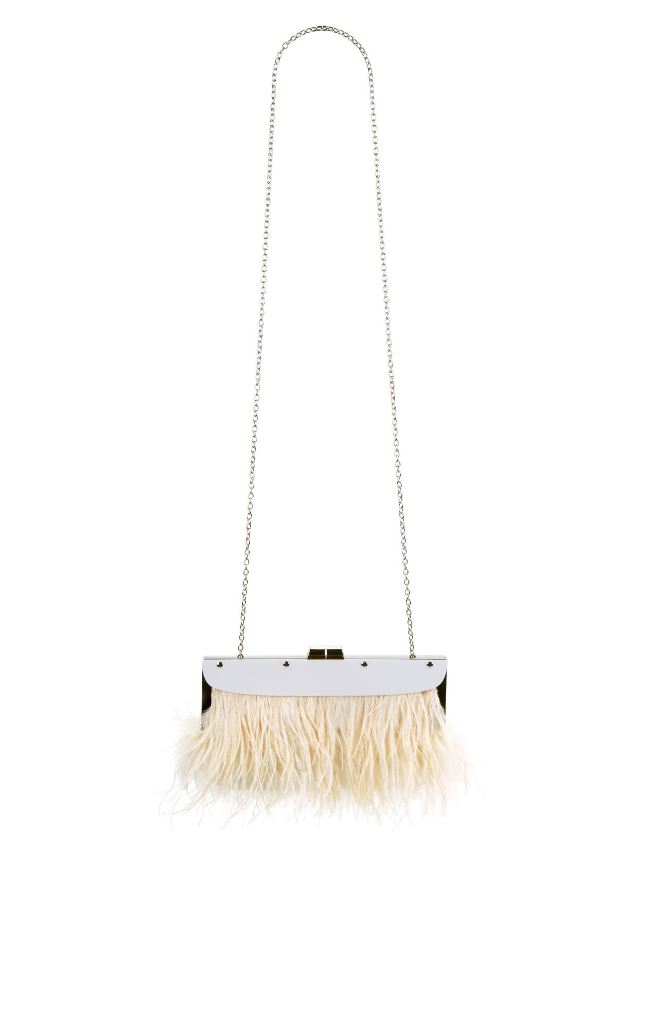 Her feather clutch features a lucite and metal frame, drop-in chain, and push-clasp closure.