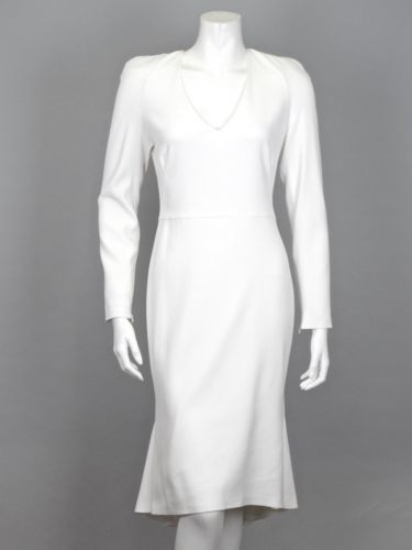 Her medium-weight crepe LWD boasts a v-neck, raglan style long sleeves with zippers at the cuffs, shoulder pads, and a flounce hem. Christina tailored her frock for a snug fit.