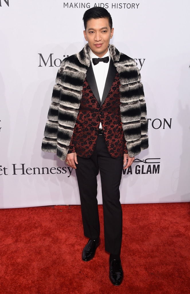 Bryan Boy kept warm in a striped fur, layered over his printed sport jacket.