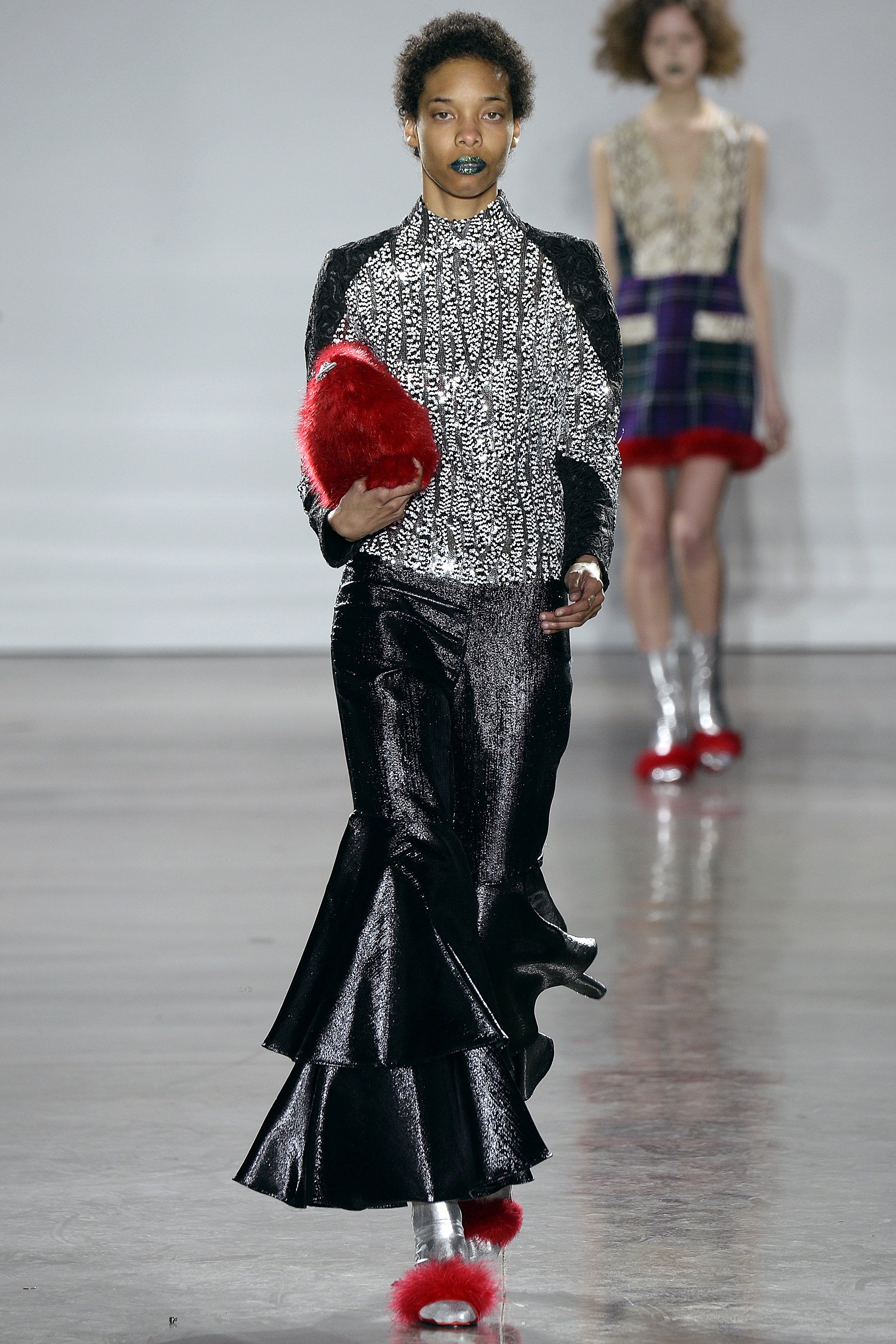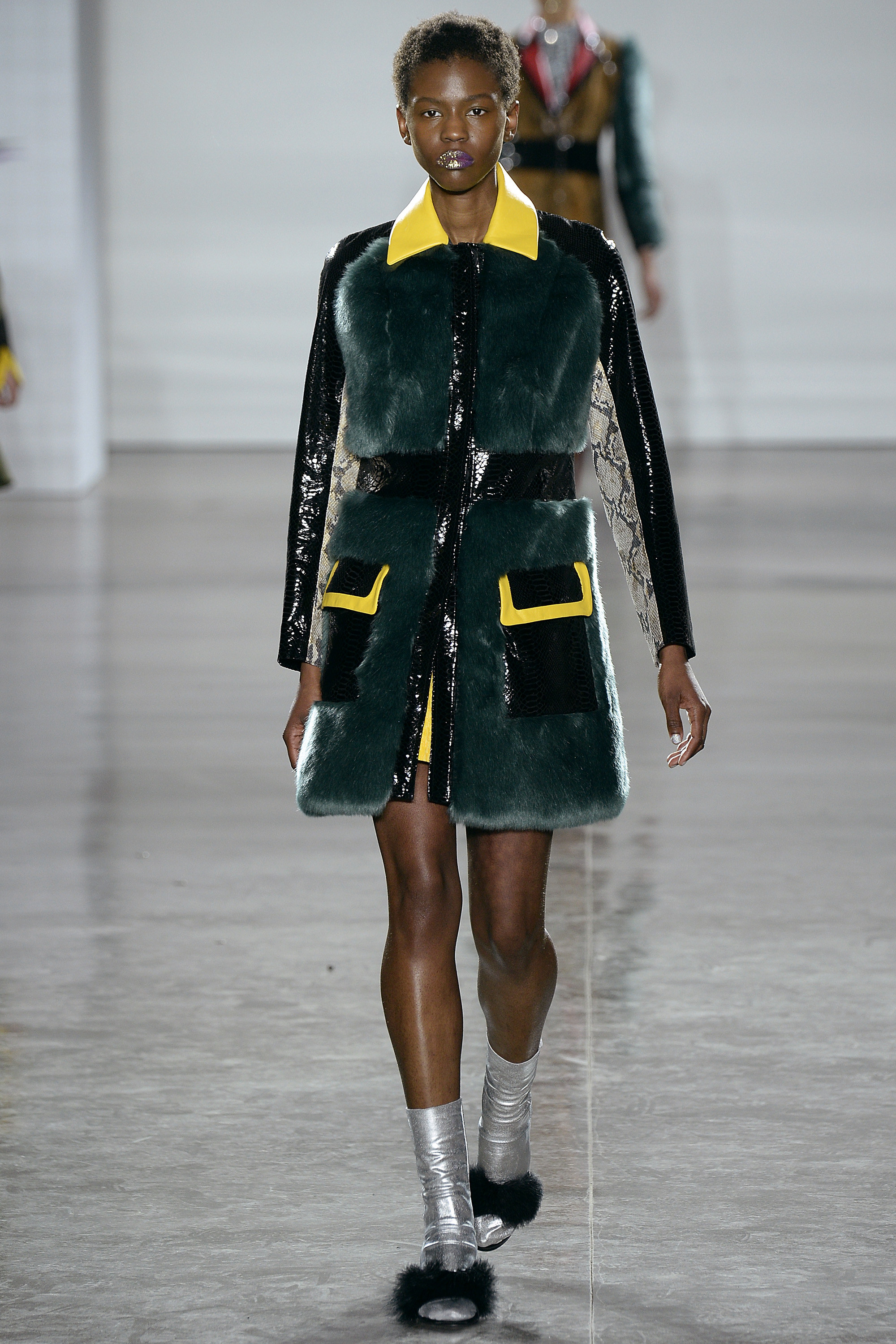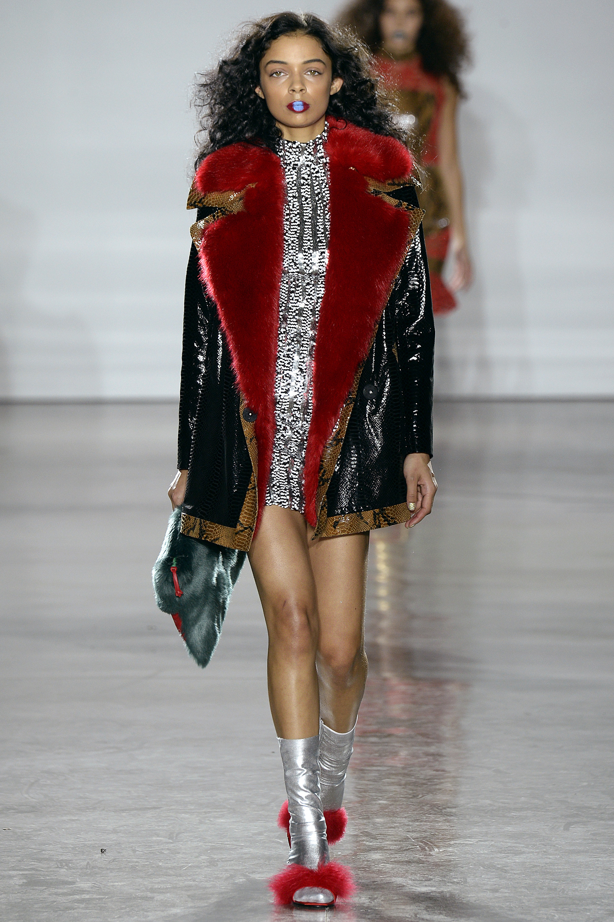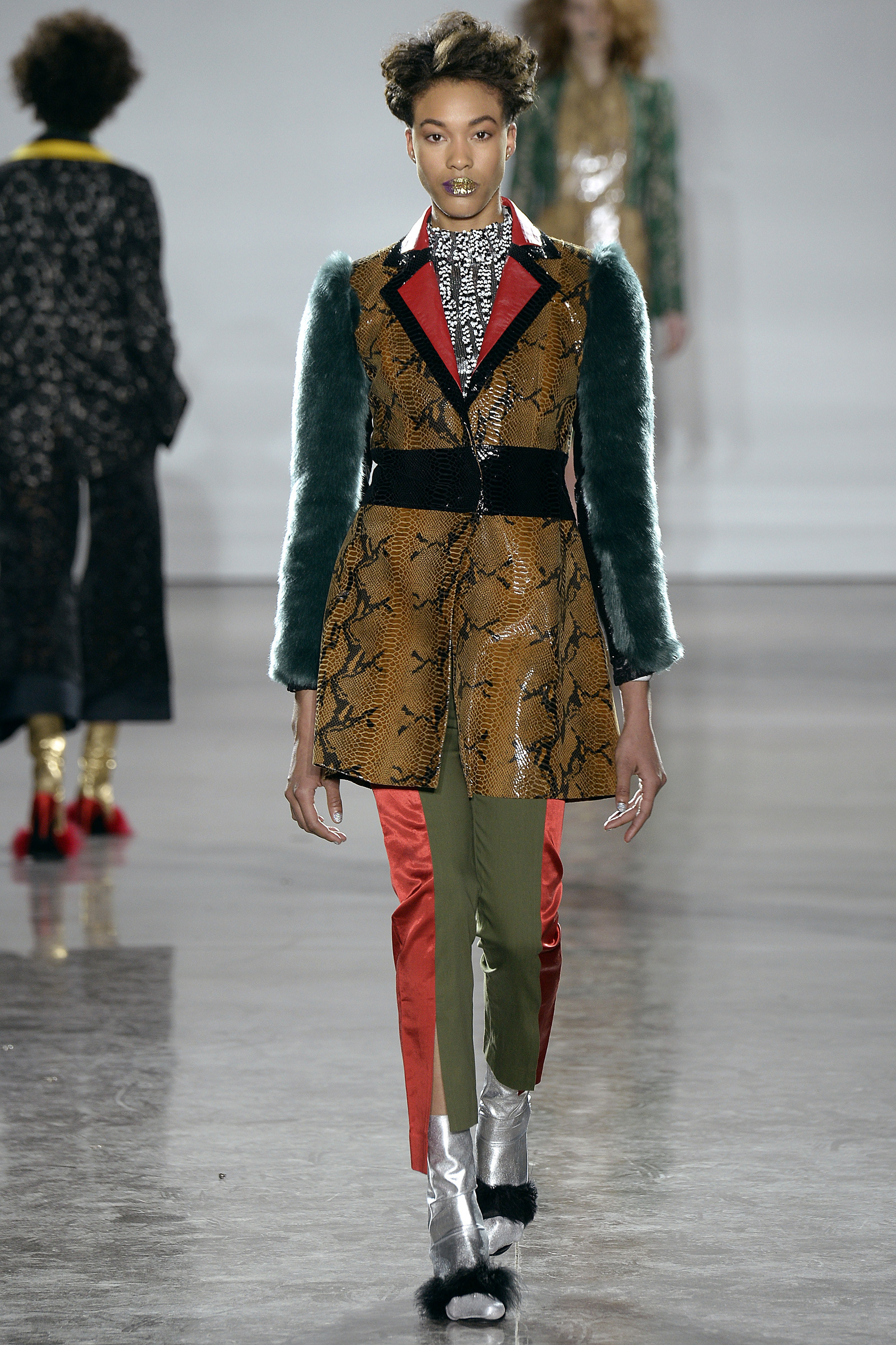 Born in the US and raised in Rome, Shui honed her design chops at Parsons The New School for Design and Central St. Martins. Her Fall collection debunked the idea of autumnal neutrals, brimming with bold brights including yellow, cherry red, and even turquoise and forest green lipstick on the models for good measure. Fur called forth the season on functional shawls, metallic boots with fuzzy trim, two-tone python jackets that were for fashion’s bravest with colorblock detailing, and the crimson red lapels of a 70’s chic coat.