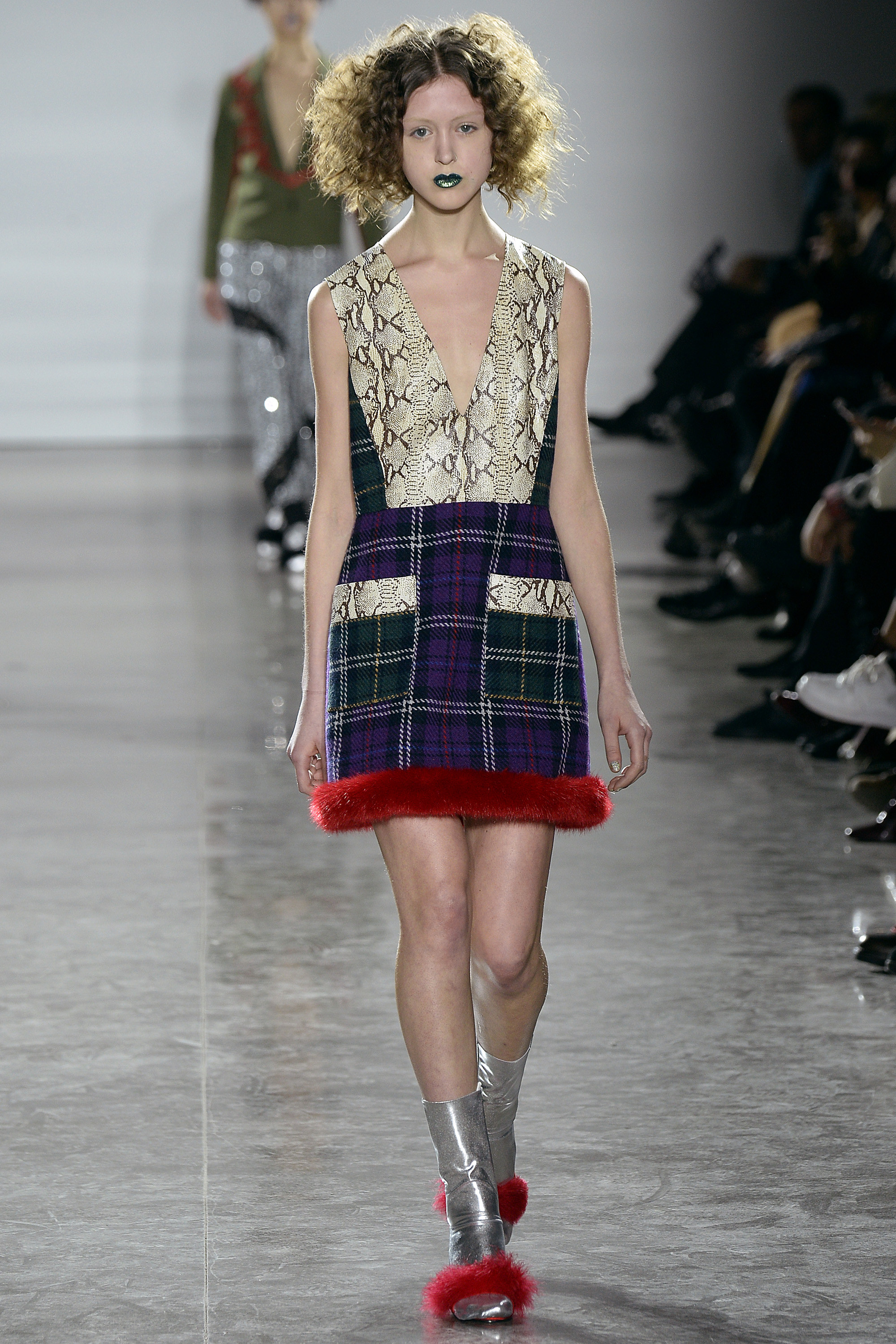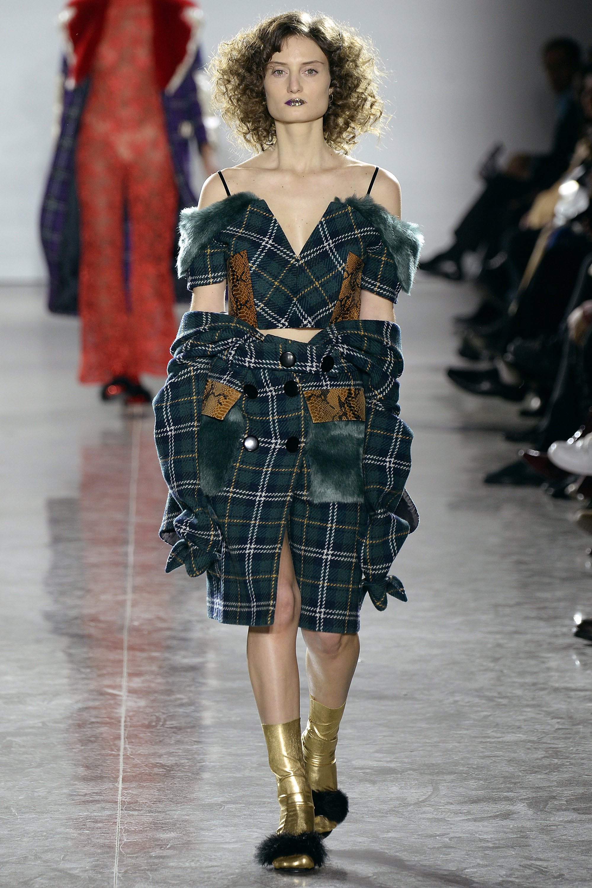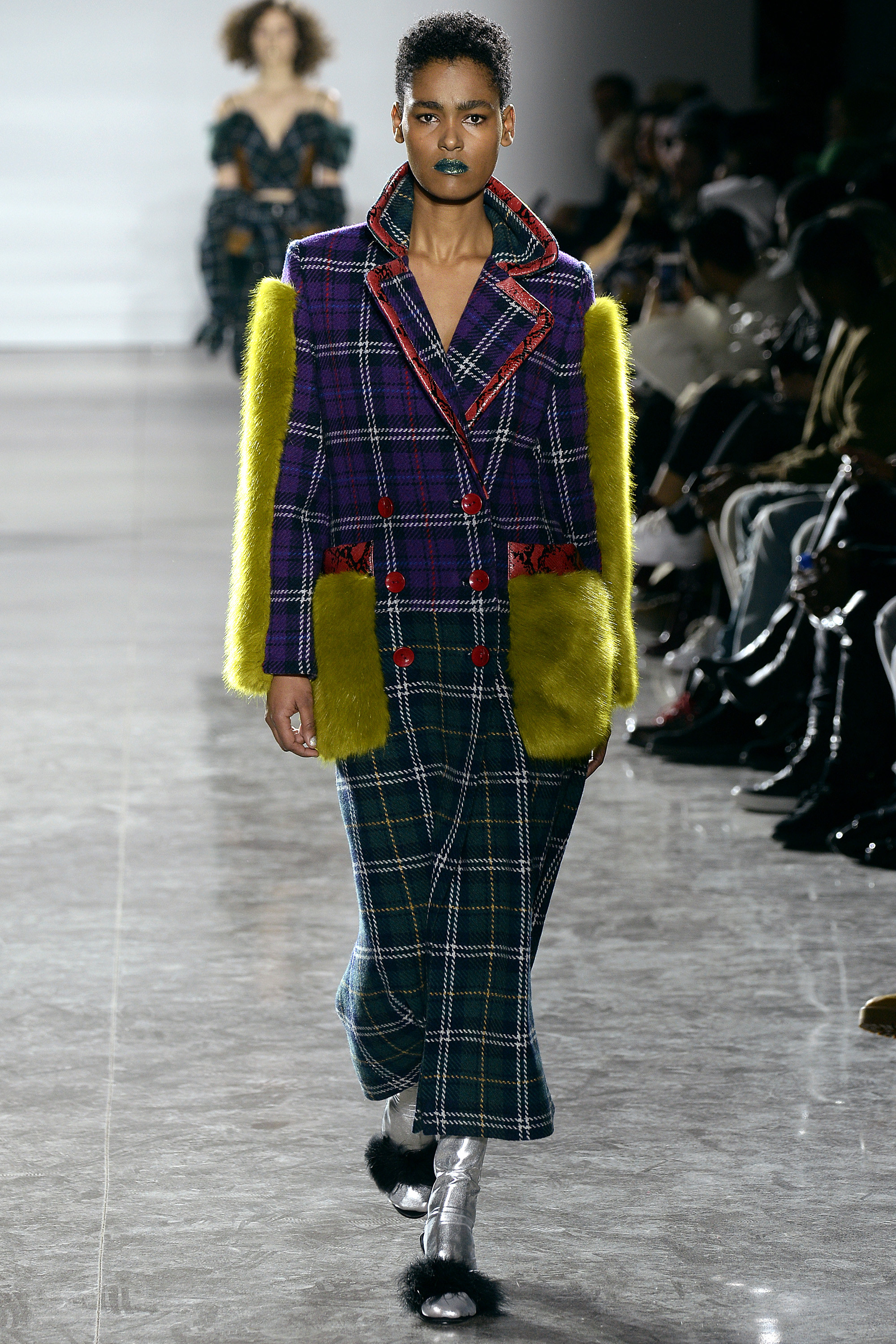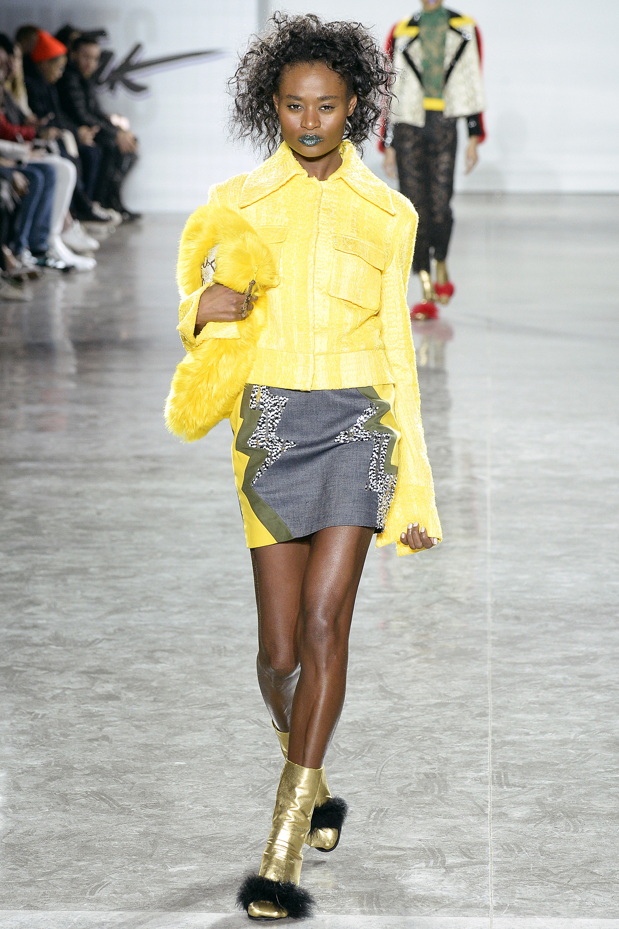 Born in the US and raised in Rome, Shui honed her design chops at Parsons The New School for Design and Central St. Martins. Her Fall collection debunked the idea of autumnal neutrals, brimming with bold brights including yellow, cherry red, and even turquoise and forest green lipstick on the models for good measure. Fur called forth the season on functional shawls, metallic boots with fuzzy trim, two-tone python jackets that were for fashion’s bravest with colorblock detailing, and the crimson red lapels of a 70’s chic coat.