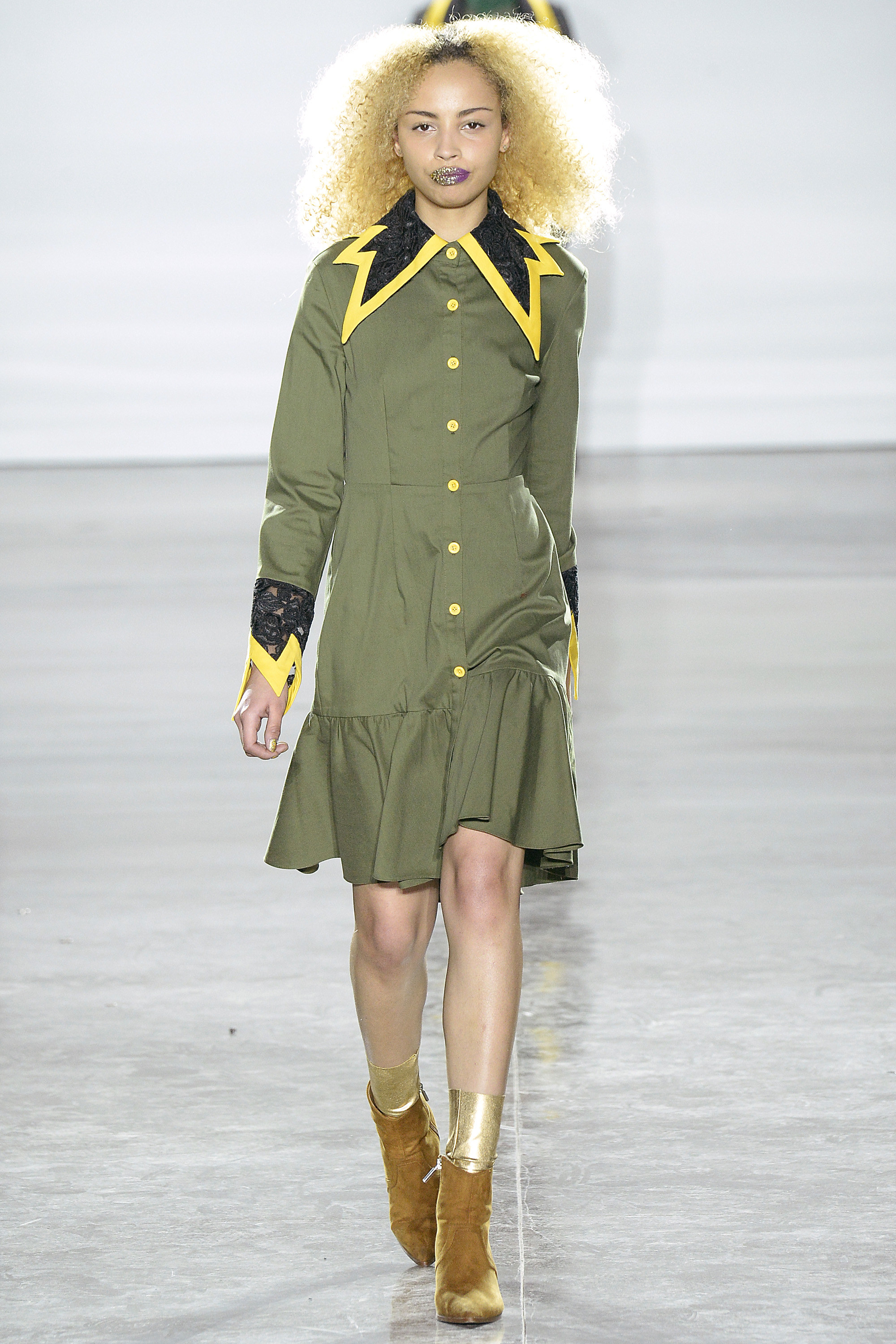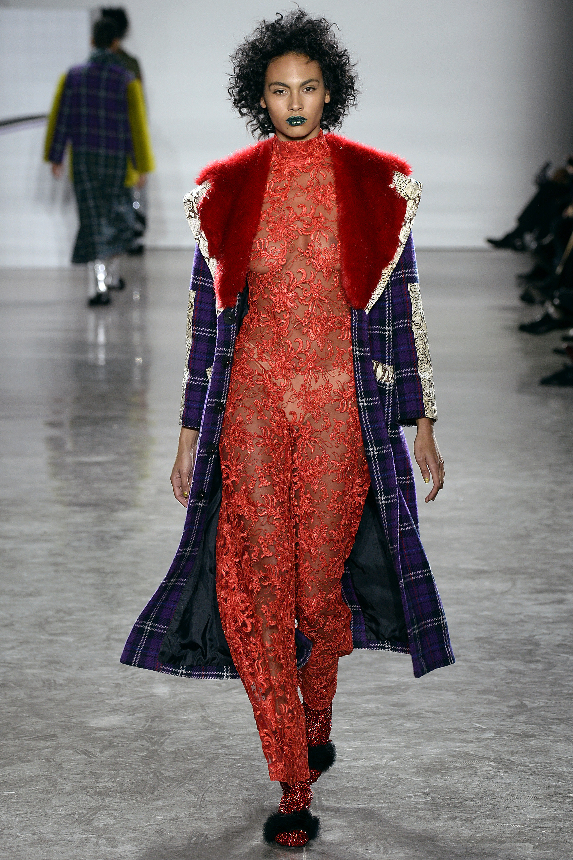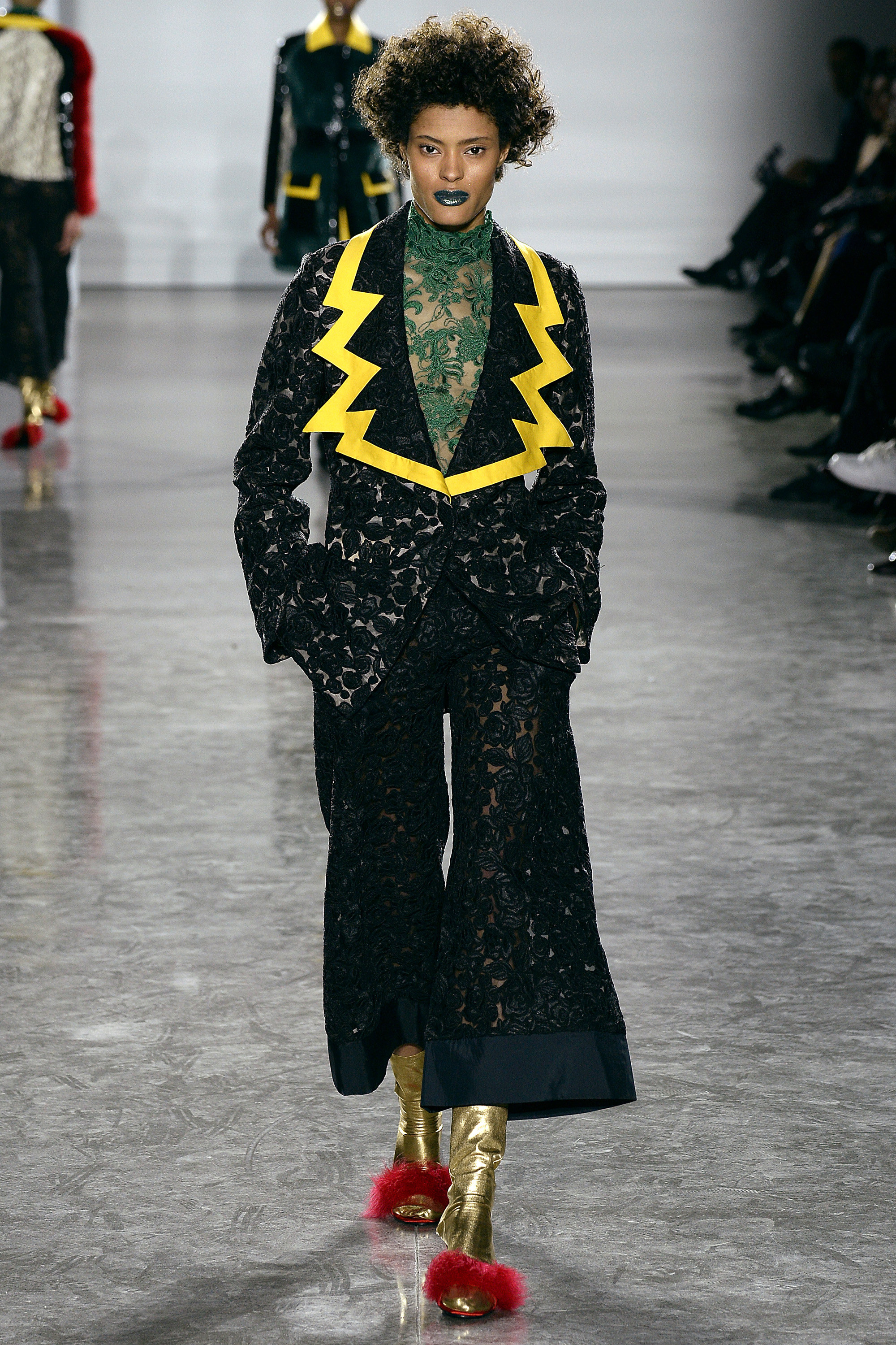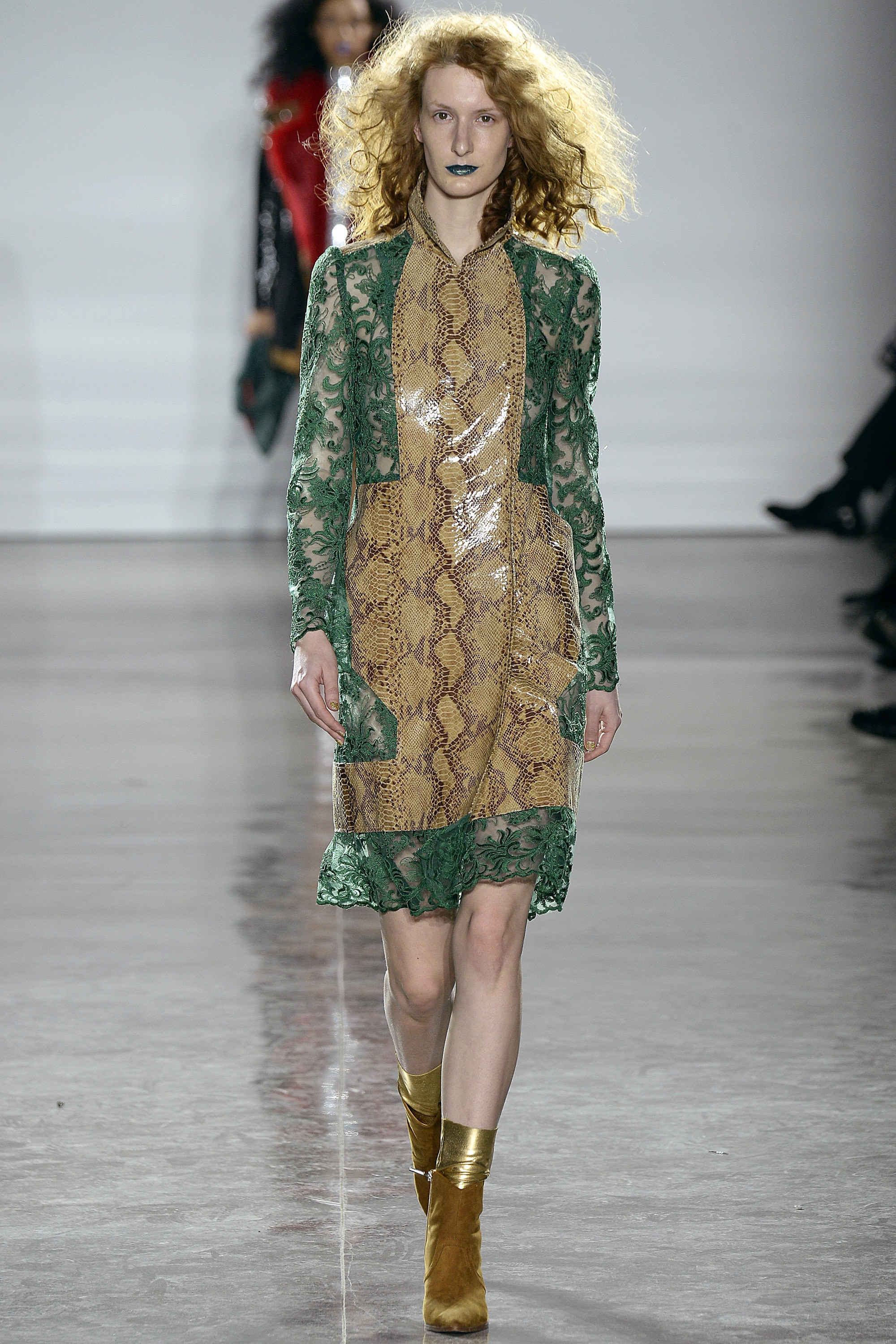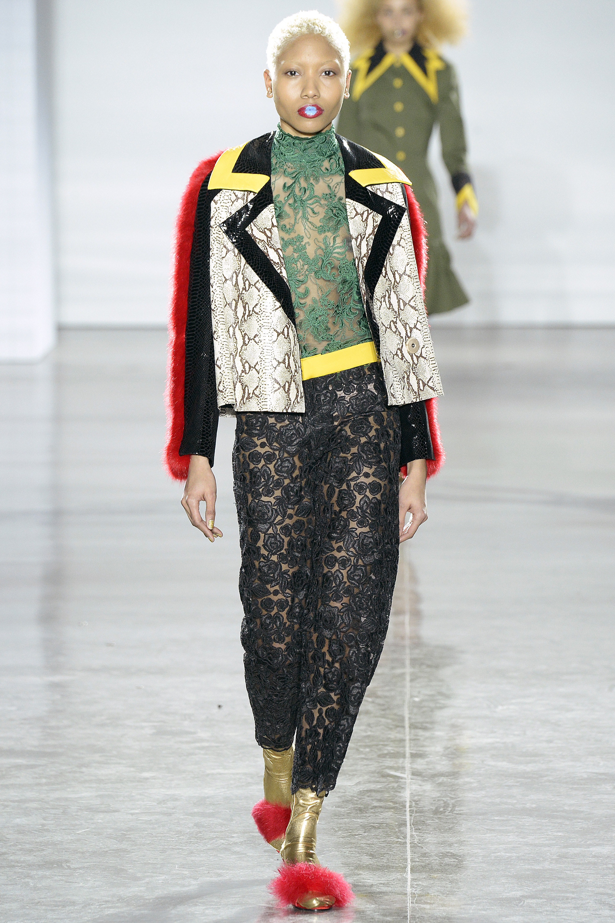 Romantic lace accented a ladylike shirt dress with ruffle hems, a culotte suit layered over a sheer turtleneck, a duo of dresses demure in silhouette but showstopping with green and red versions of the amorous fabric and exotic python panels. Not for the faint of heart, but definitely something daring style mavens like Rihanna and Solange could undoubtedly wear well.