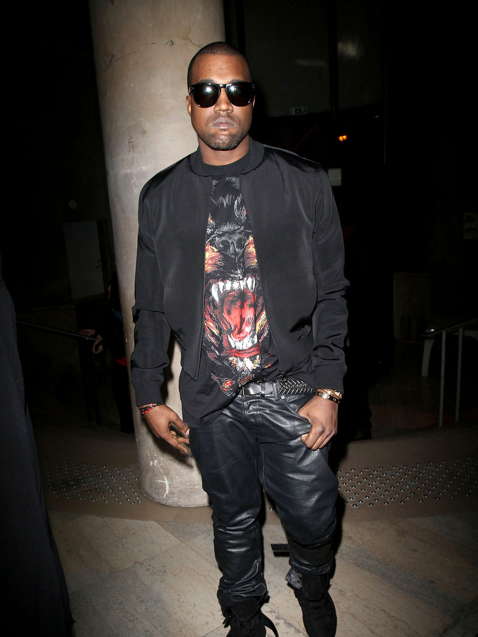 You will also frequently catch him in his leather jogging pants (which he claims he founded), or some of his favorite designers and brands that he proudly professes whenever he can: Versace, Ralph Lauren (who just gifted Saint West with a jacket, FYI), and designers such as Stella McCartney, Phoebe Philo, Riccardo Tisci, and Raf Simons.