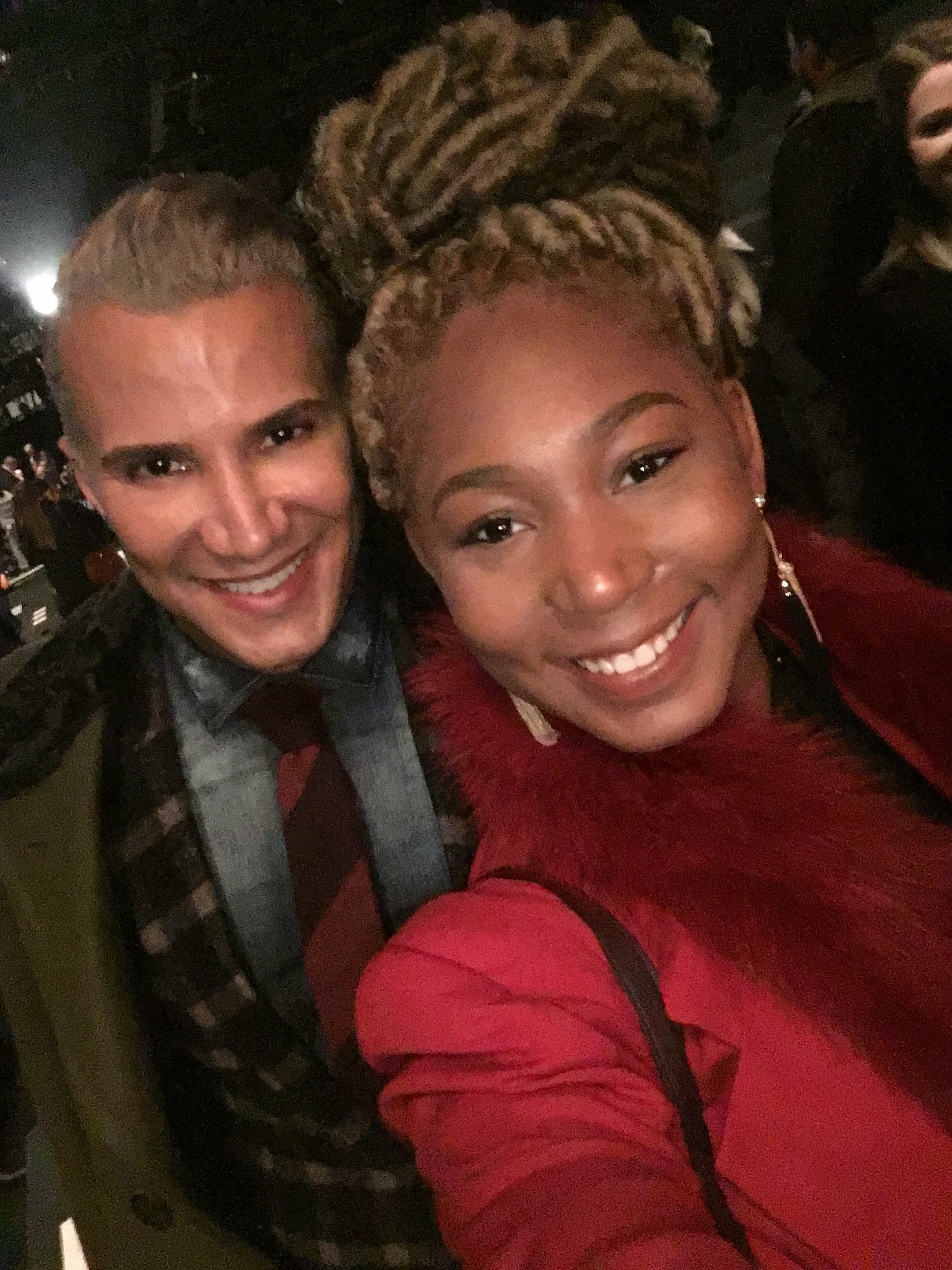 Although a bit blurry, you can clearly see I was all grins when I caught my selfie with Mr. Jay Manuel himself, who was quickly heading out the door to catch a flight to Toronto! He had on a Dsquared2 blue shirt, Paul Smith patchwork suit, and that stunner olive green Gucci coat. Hot!
