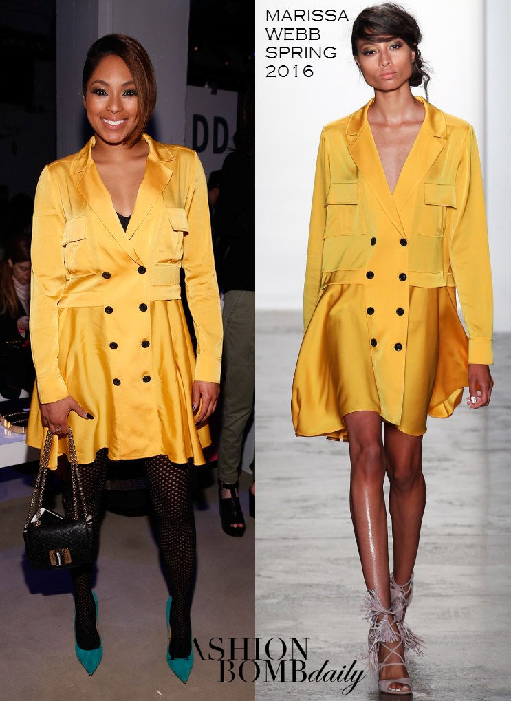 Alicia Quarles went bold at the Marissa Webb Fall 2016 Show in the brand’s Spring 2016 Yellow Silk Dress and Schutz Green Suede Pumps: