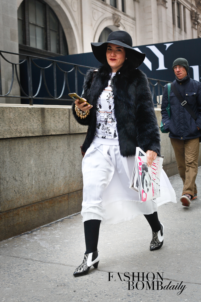 So we have a gang of street style photogs out and about, taking pix of stylish fashion show goers. Brandon Isralsky was one of our dedicated troops, who staked out in front of Moynihan Station for the day shows, then Madison Square Garden for Kanye West’s Yeezy Season 3 collection. What he captured: colorful coats, black and white tones, fur trims, and much more.