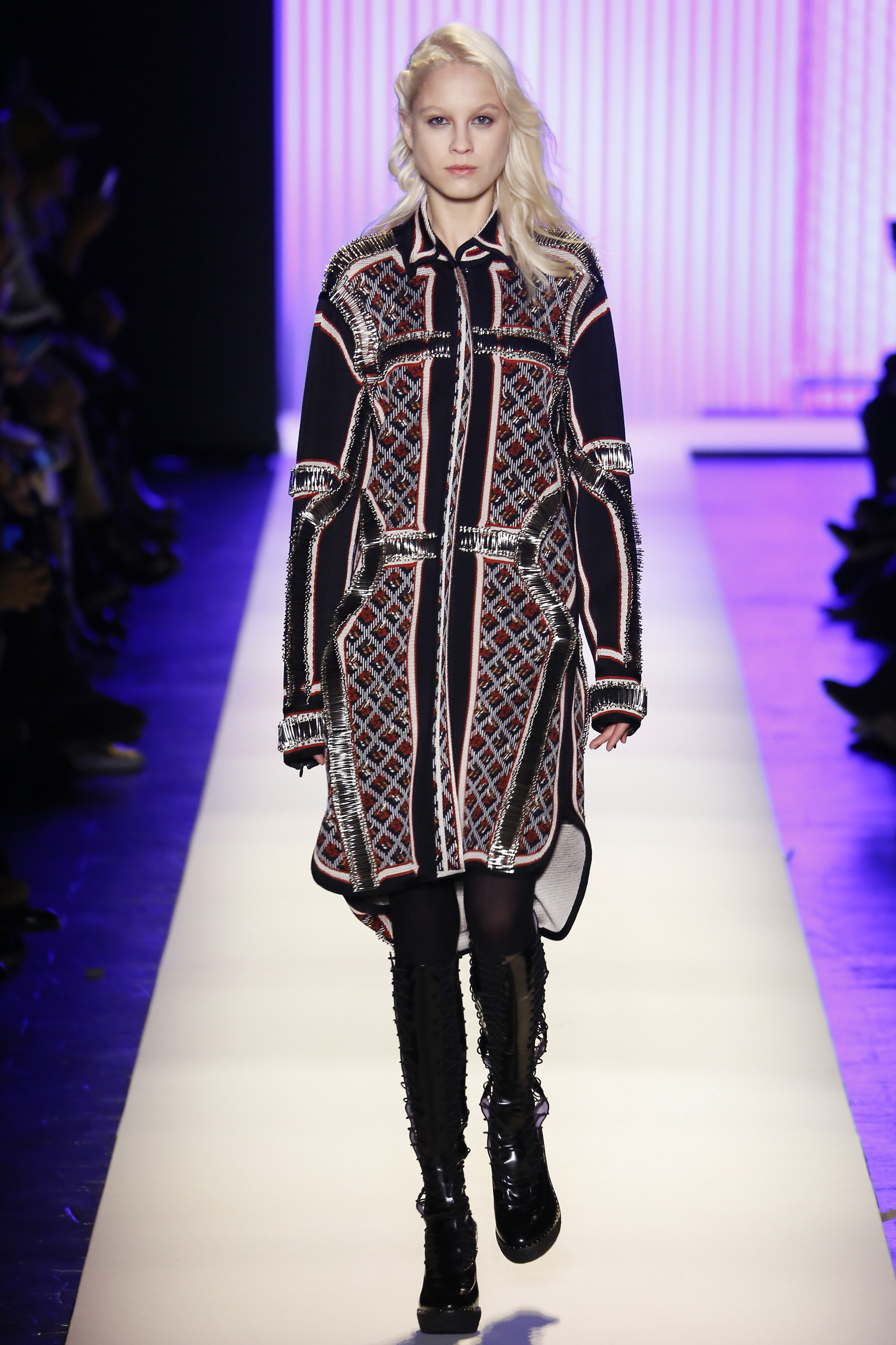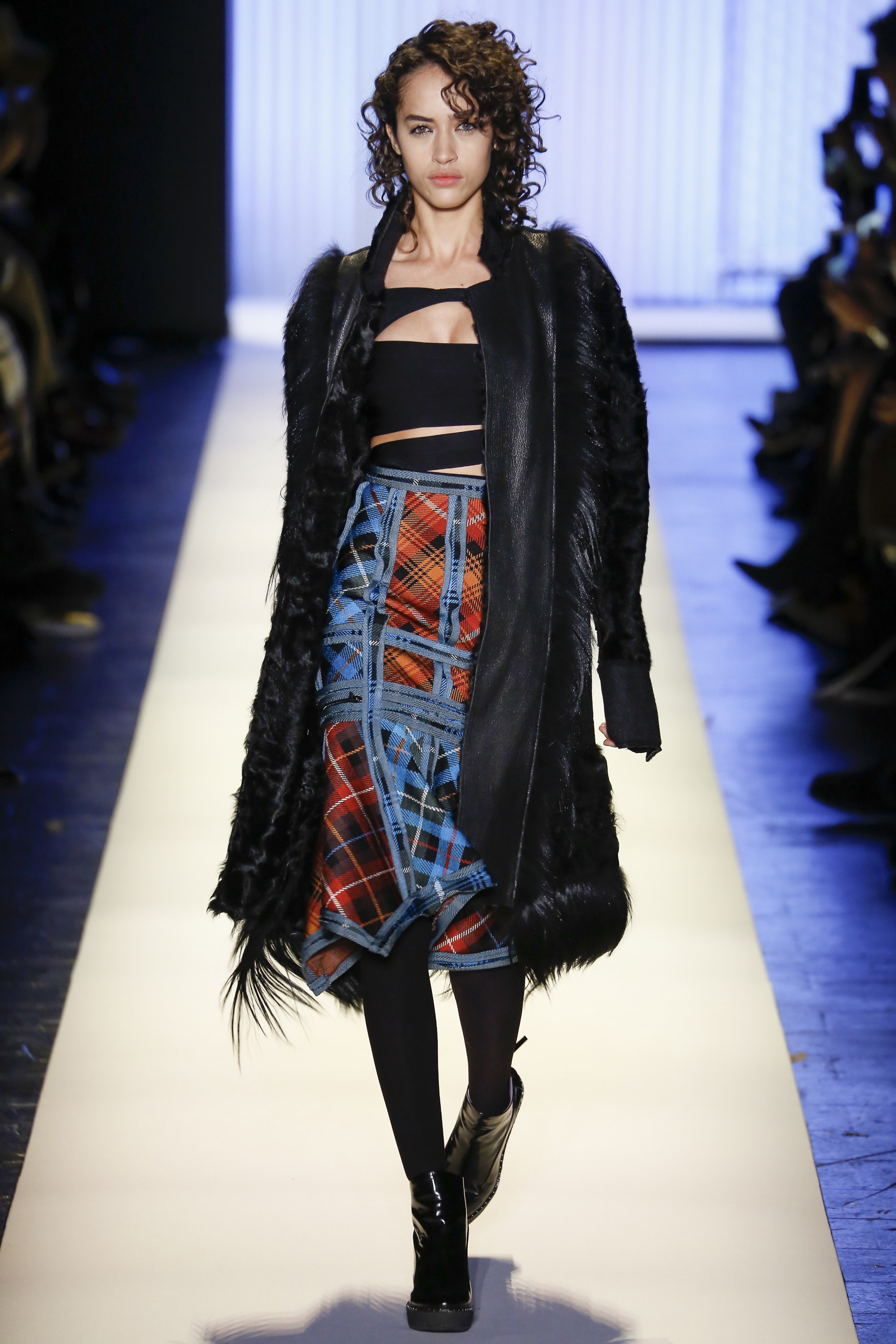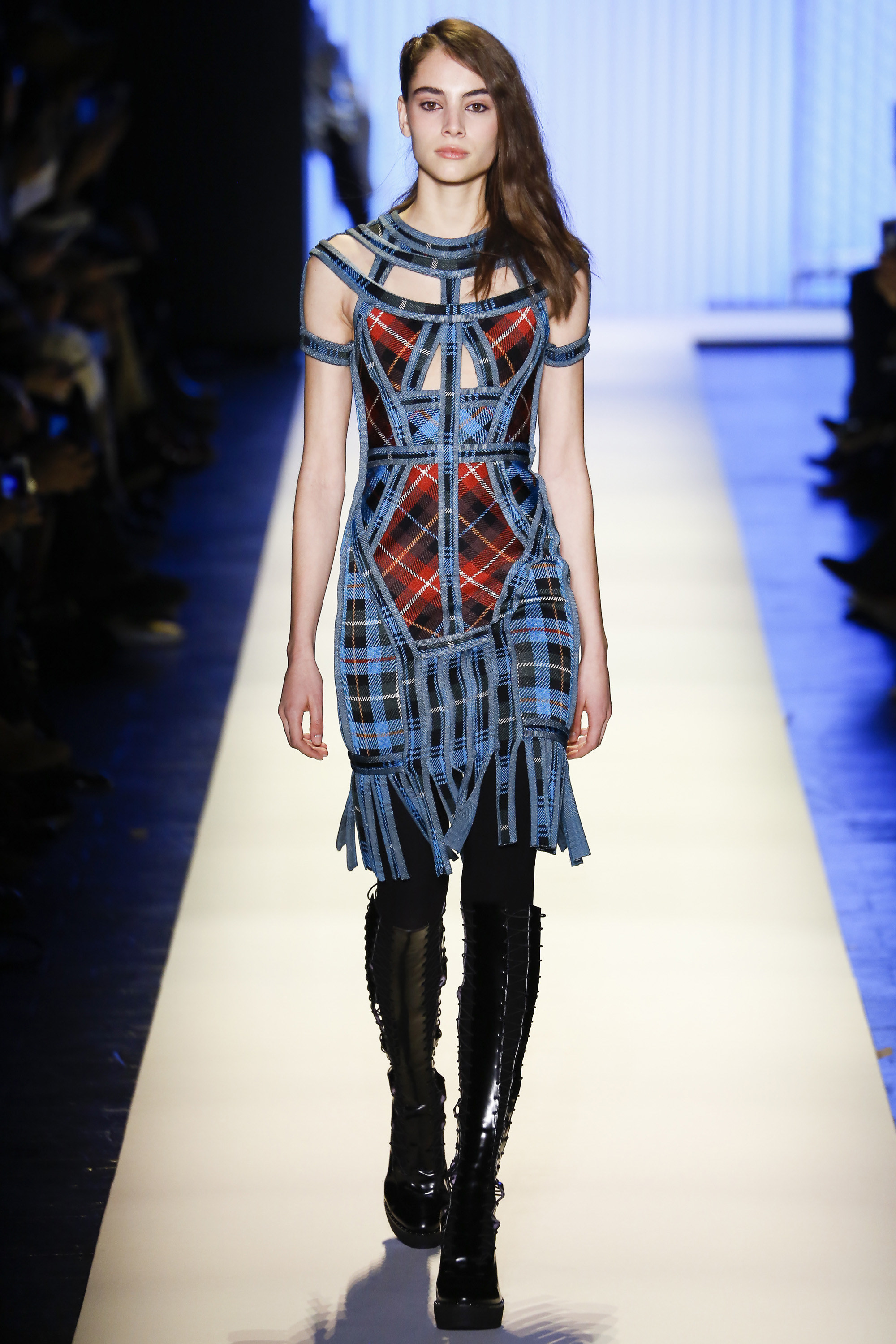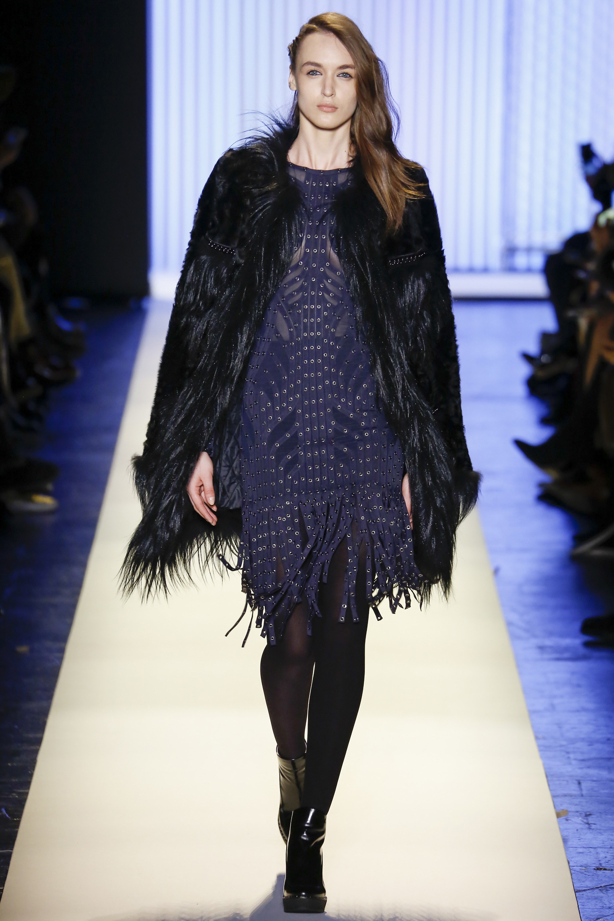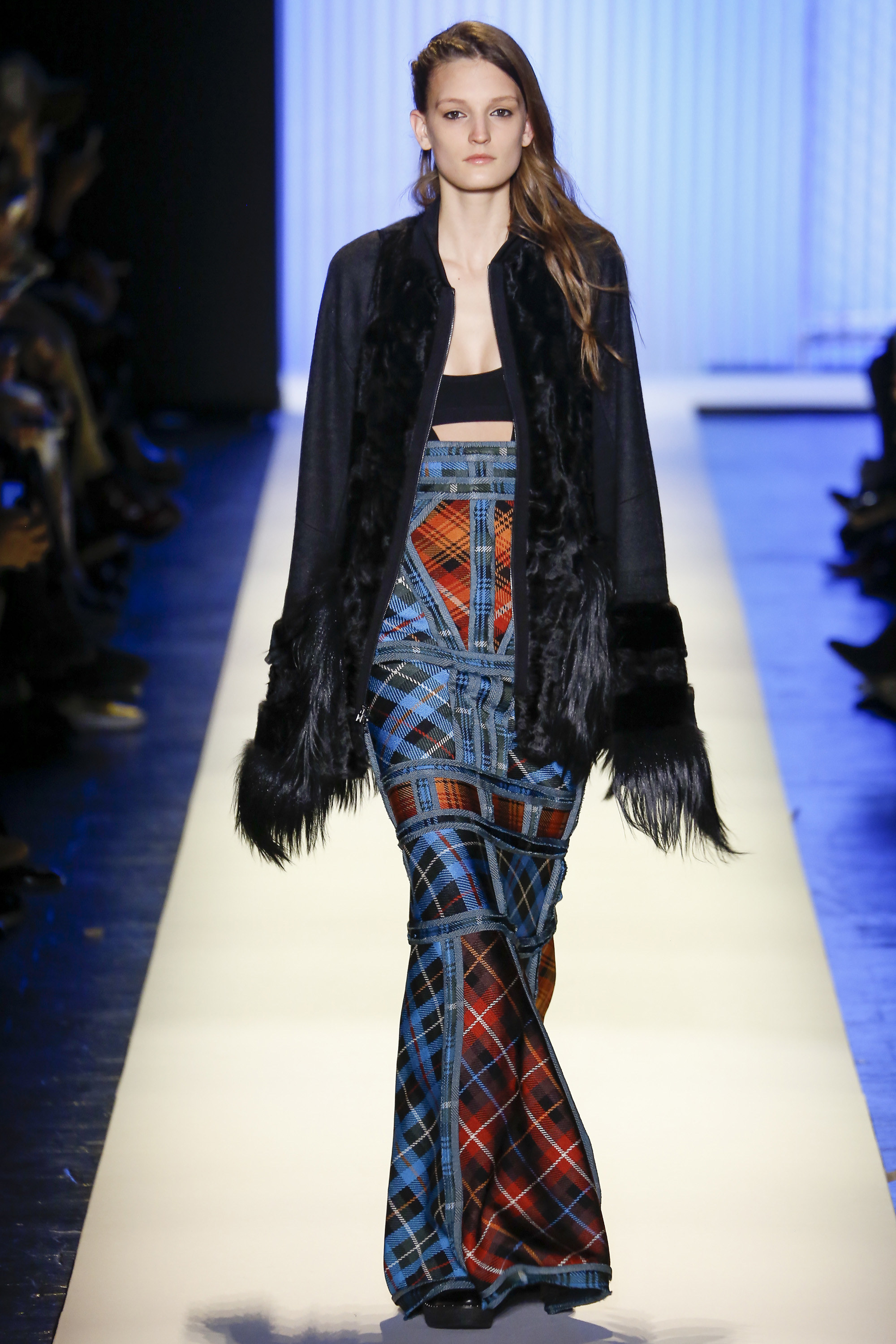 Down the runway, there were a plethora of texture and colors, accented with plaid, fringe and brazen embellishments. Bright colors showed throughout the collection, brightening up the provocative collection that featured a multitude of knee-grazing dresses, fur coats, and striped bandage ensembles.