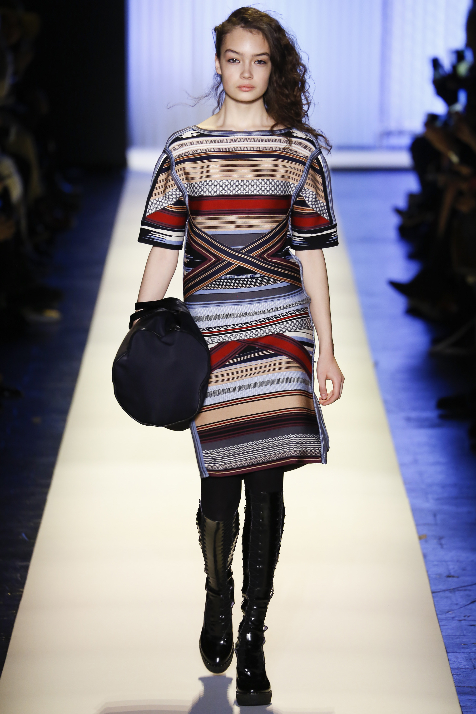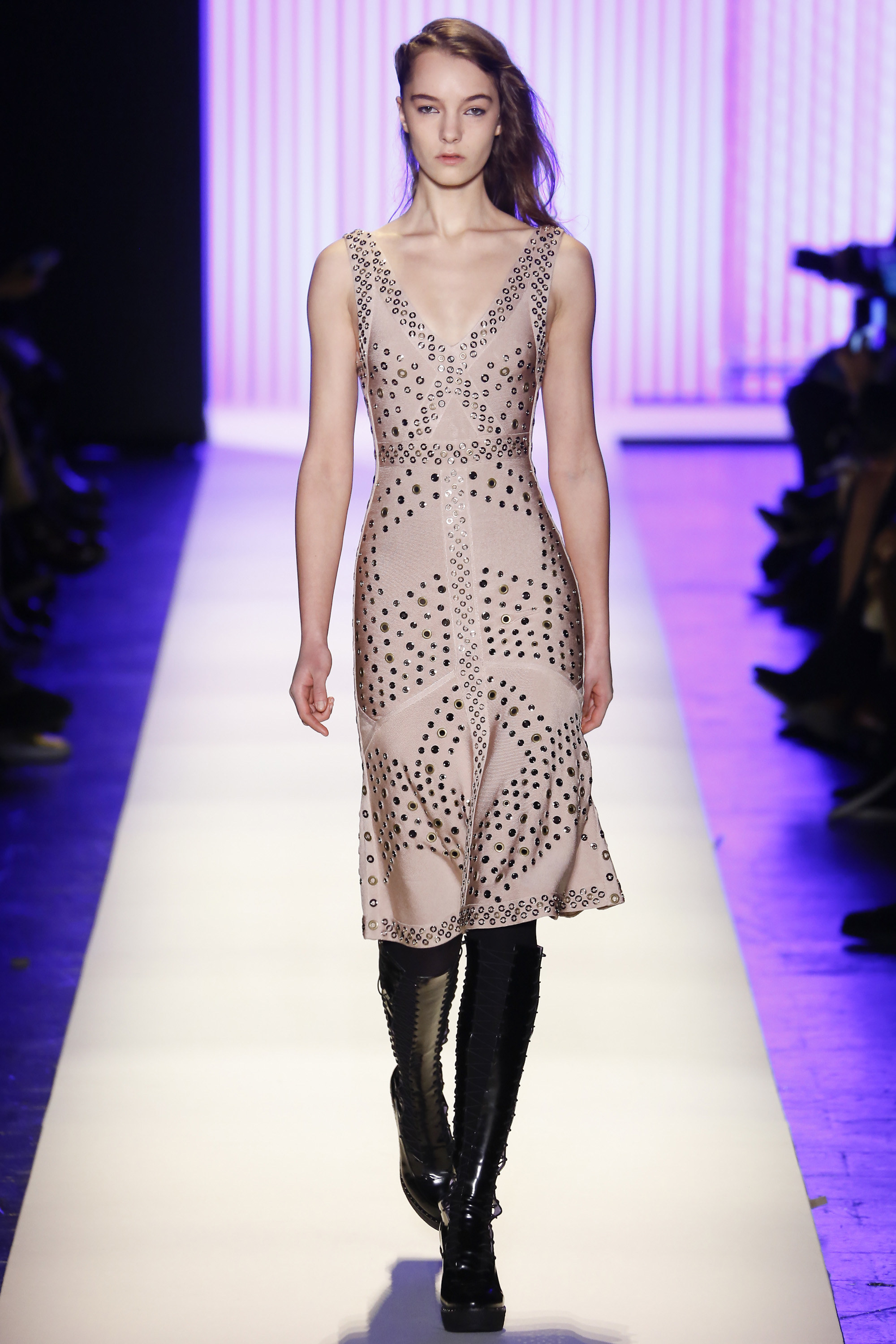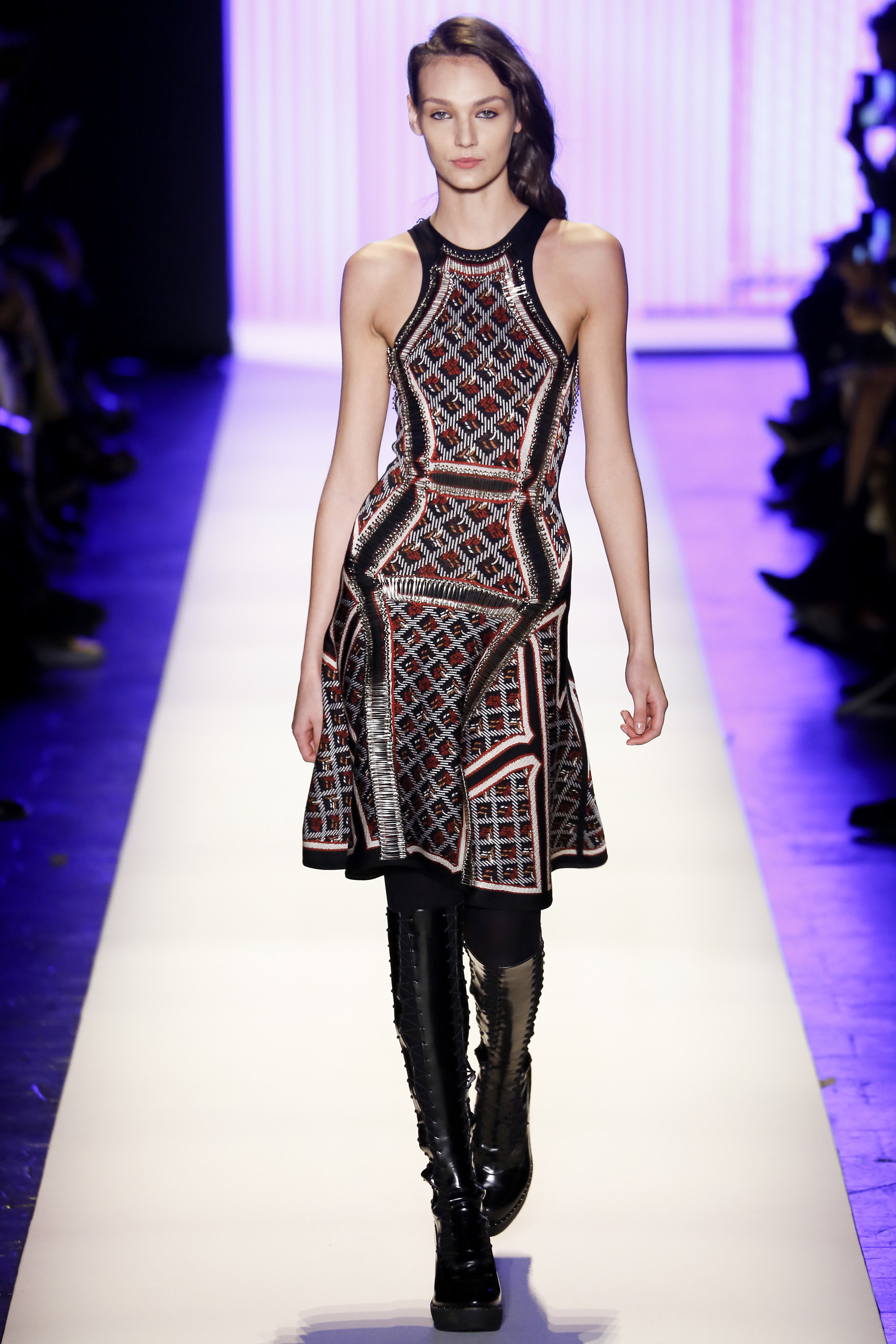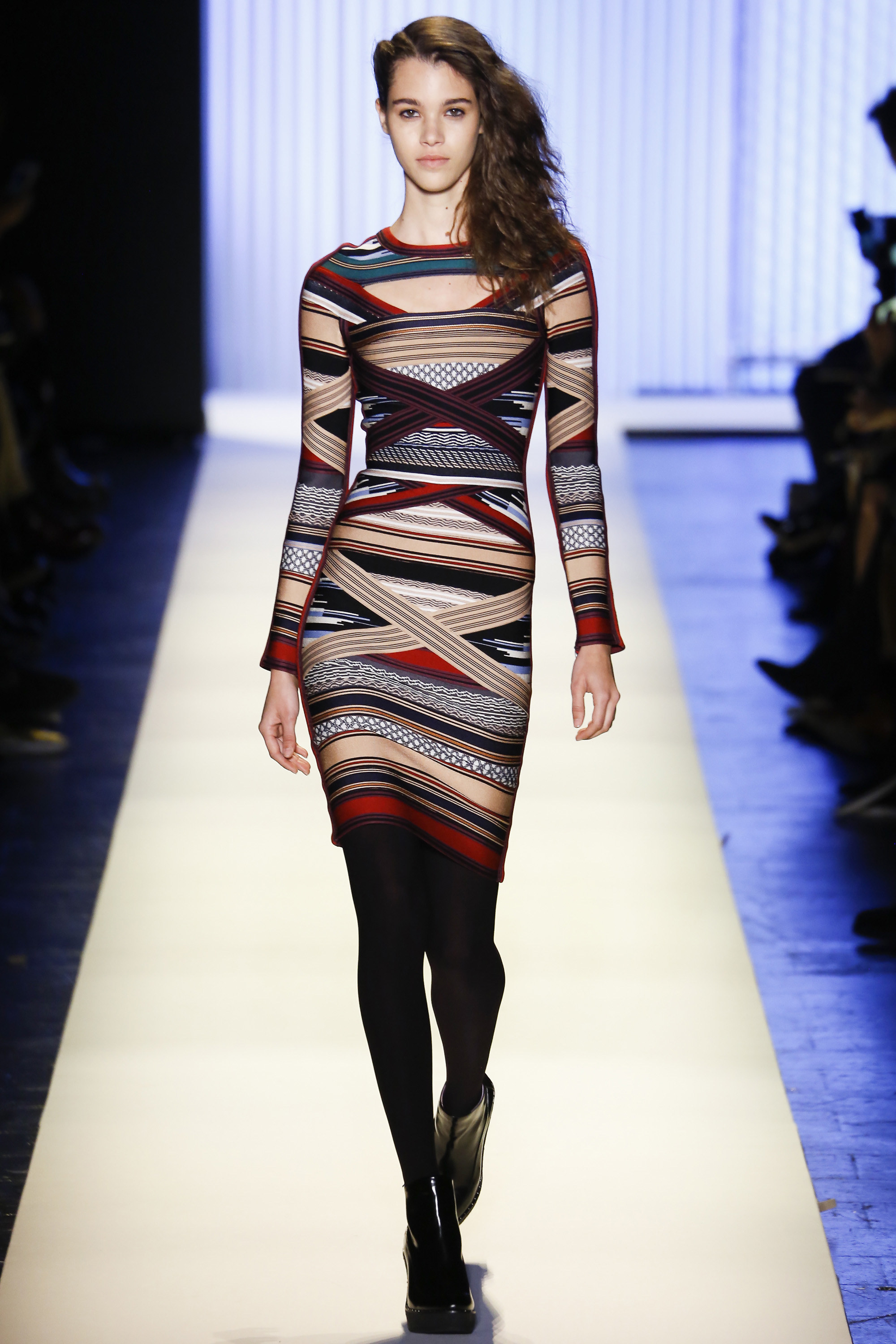 Despite the juxtaposition of patterns and textures that were found in many of the looks, the classic body-con silhouette continued to shine through the piece, celebrating the sensuality of womenswear that Herve Leger has come to be known for.