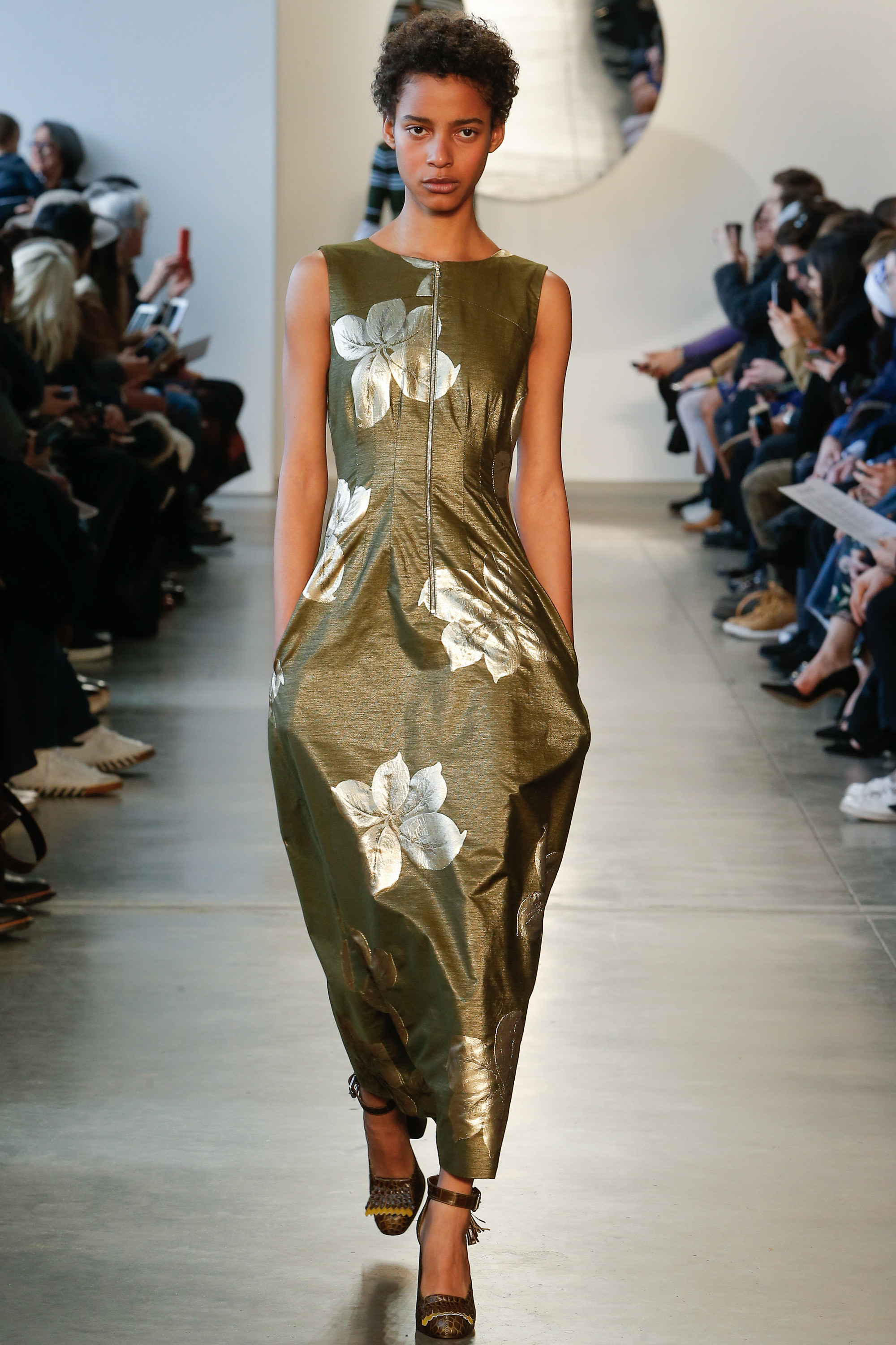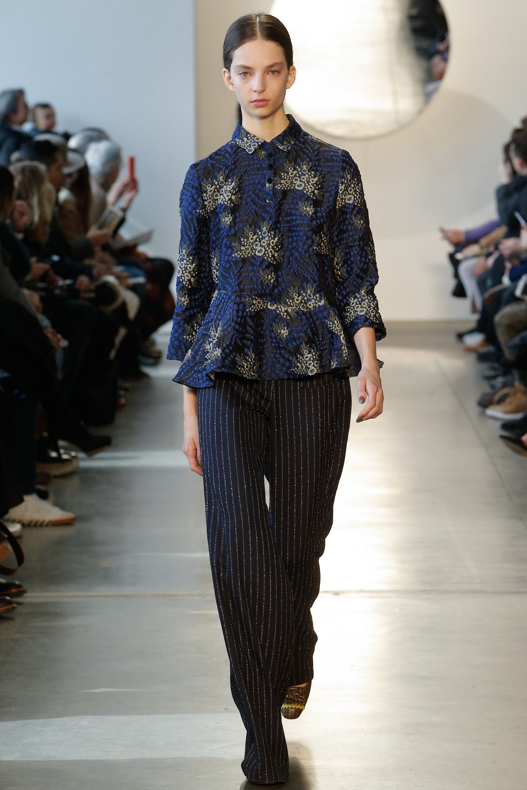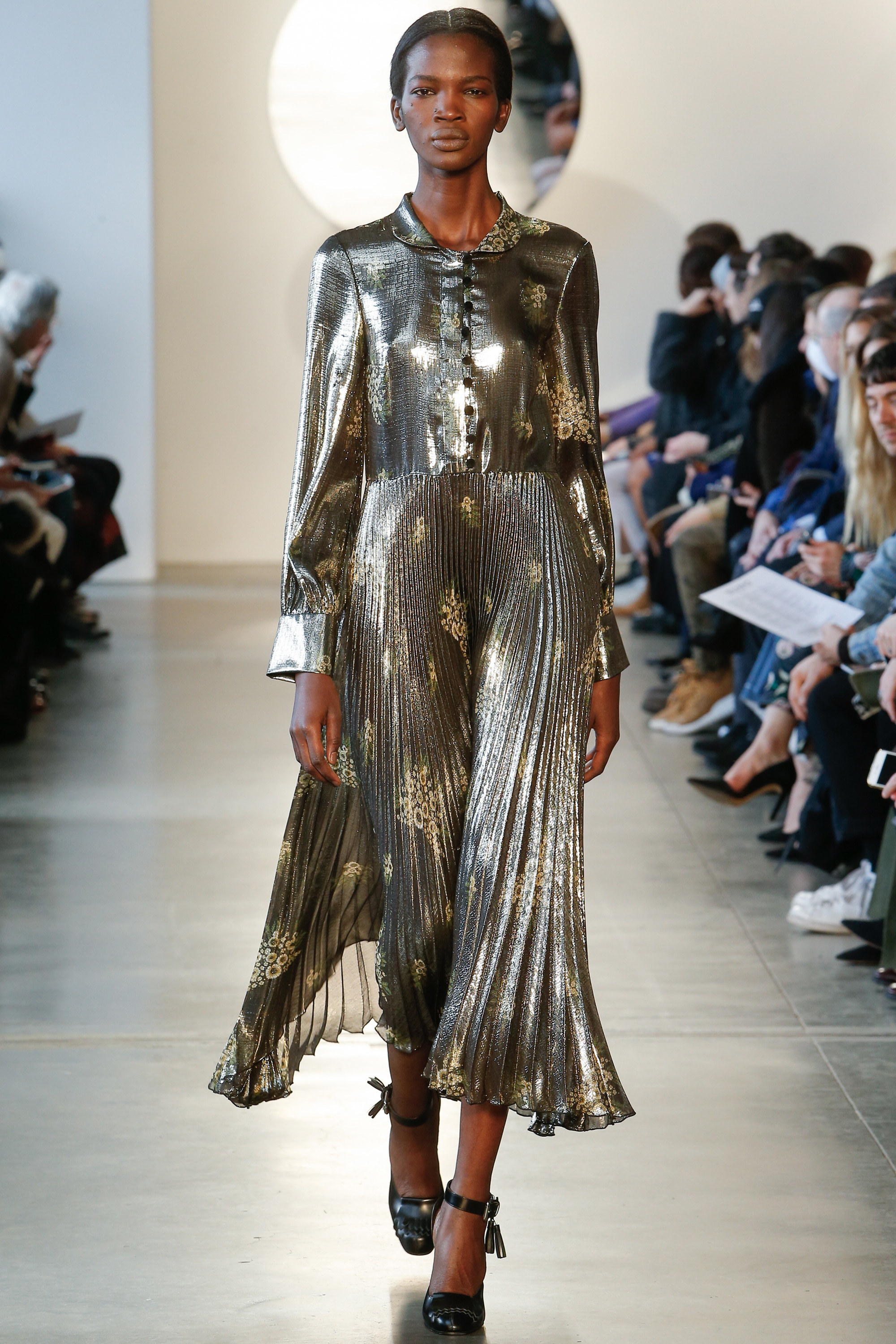 I admit, I can’t deny a good pinstripe! And, Suno certainly delivered. Models showcased innovative ways to casually style this workwear print by adding wrap touches, playful bell sleeves and dark-hued florals. There was also an impressive amount of proportion play, layered ruffles and statement metallics.