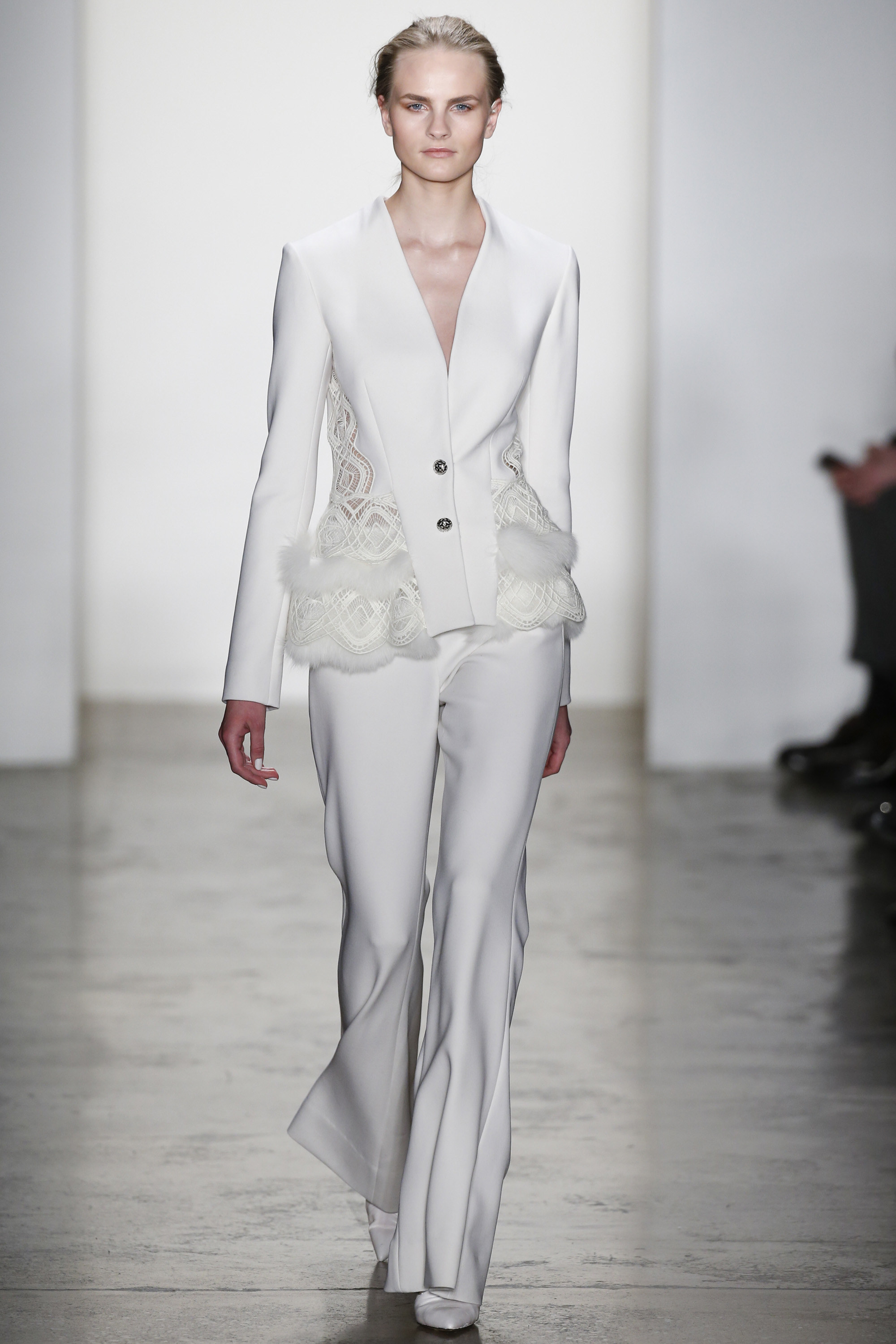 White/navy lace midi dresses, sleeveless turtleneck tops, tailored peplum jackets and ruffled wonders all made their way down the catwalk. And, the chic vibes continued as retro-inspired suits also made a quick cameo.
