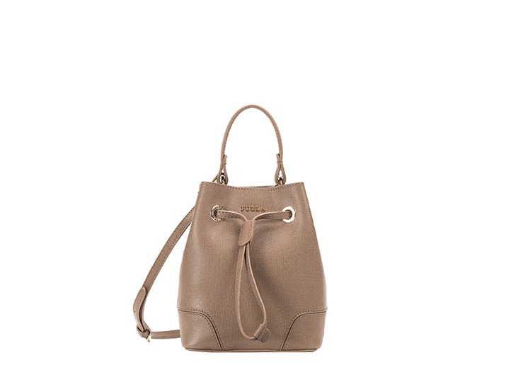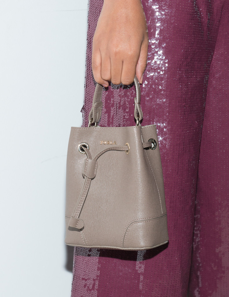Her mini bucket bag showcases a drawstring closure and single top handle strap.