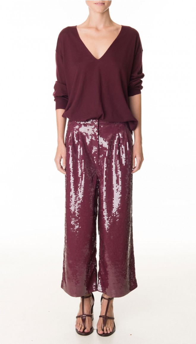 Solange Knowles took to the Tibi Fall 2016 show in the brand’s $375 Plum Featherweight Cashmere V-Neck Pullover, $895 All Over Sequin Nerd Pants, and $248 Furla Mini Stacy Leather Bucket Bag:
