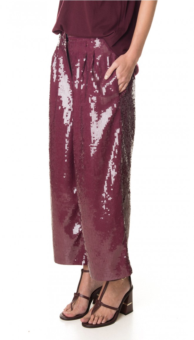 Her wide-leg cropped trousers feature all-over sequins, a flat front closure, and side seam pockets.