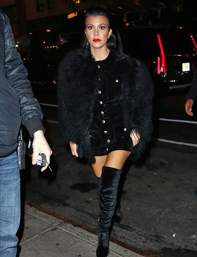 She completed her look with a black shaggy Skaist Taylor fur and Aquazzura Velvet Thigh High Boots.