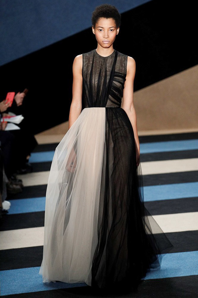 Offsetting his colorful collection, he offered alternative dresses in black and in white, flowing down to the ankles in soft fabrics of cream with plunging necklines. He featured dresses that consisted of tulle fabric, perfect for a fairytale or a dream.