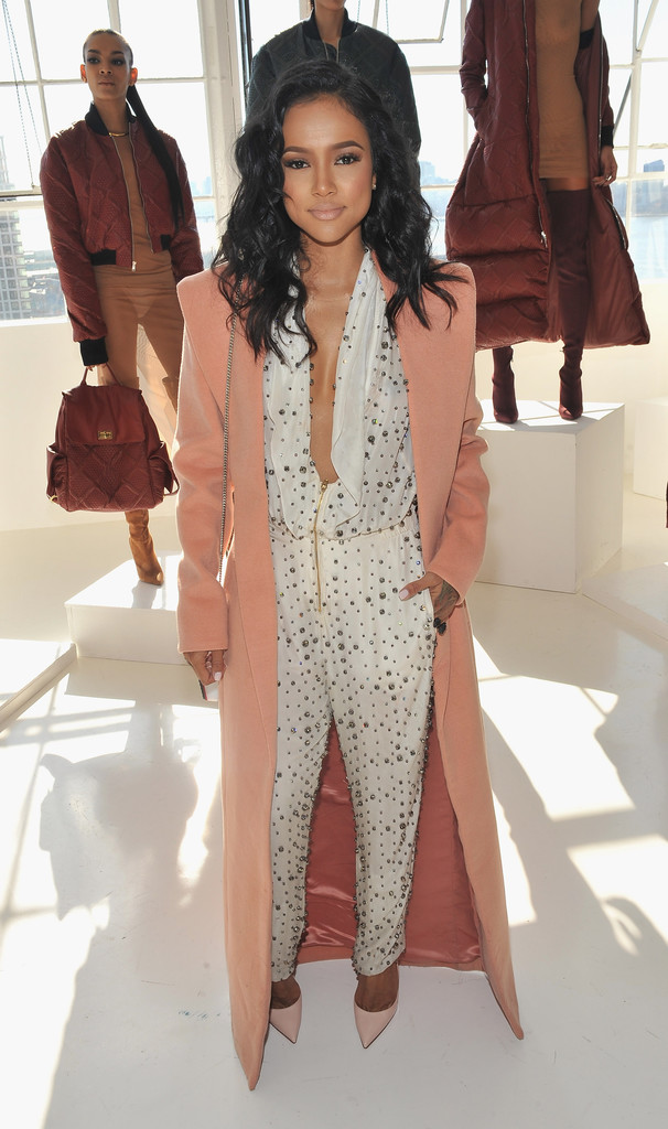 Karrueche Tran was spotted at the Laquan Smith Fall presentation in a printed jumpsuit and blush pink coat. Stunning.