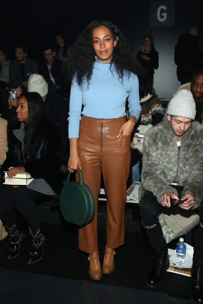 Solange Knowles was spotted front row at Baja East’s Fall 2016 show in an icy blue turtleneck from the brand and brown leather culottes. I live for her style!
