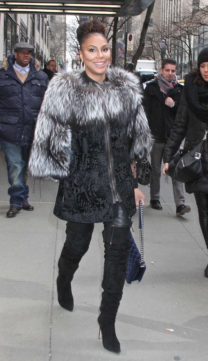 A fur shawl, black textured coat, quilted Chanel bag, and black suede thigh-high boots were on the agenda for Tamar Braxton while leaving NBC Studios. Cute no?