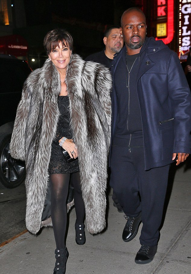 Kris Jenner partied at Hunt & Fish Club with boyfriend Corey Gamble in a glamorous fur, LBD, black tights, and embellished sandals.