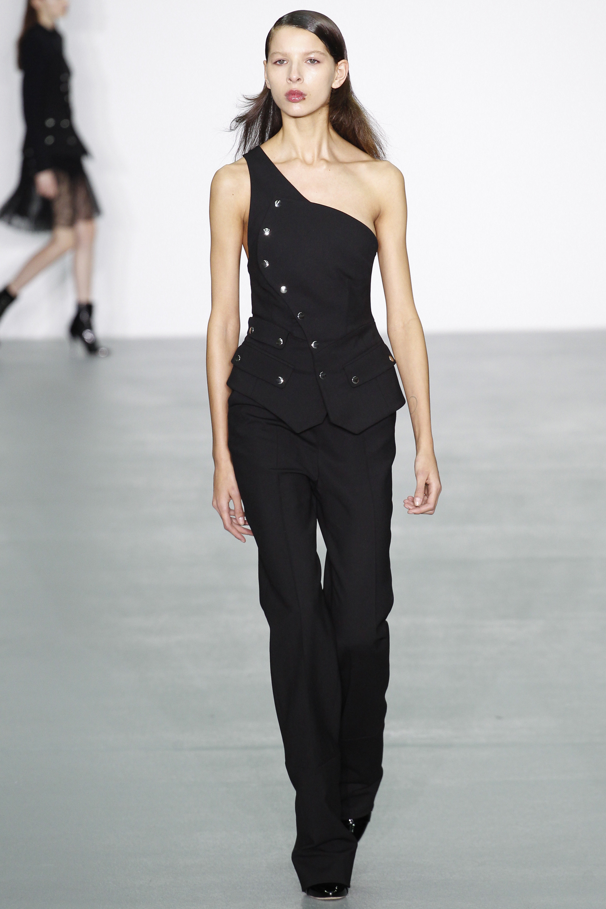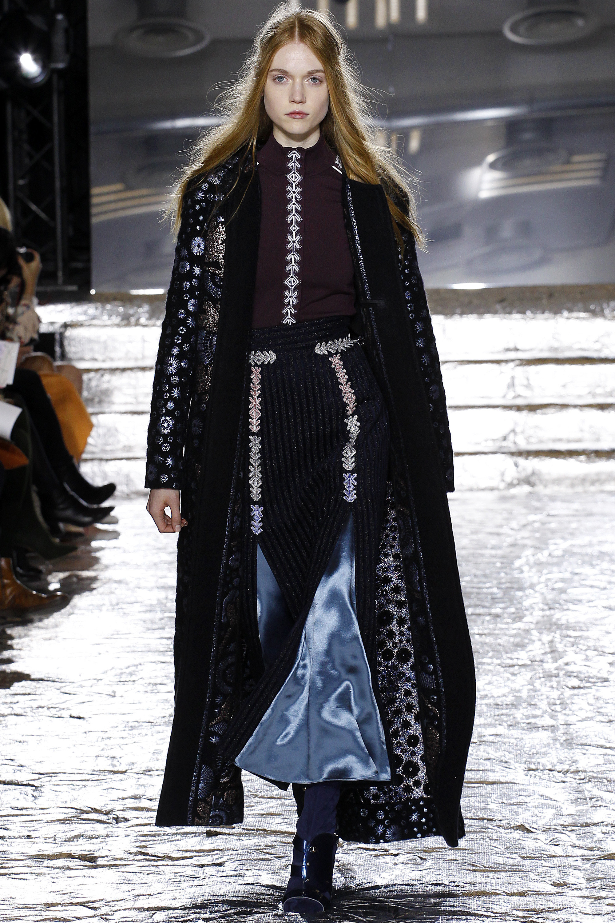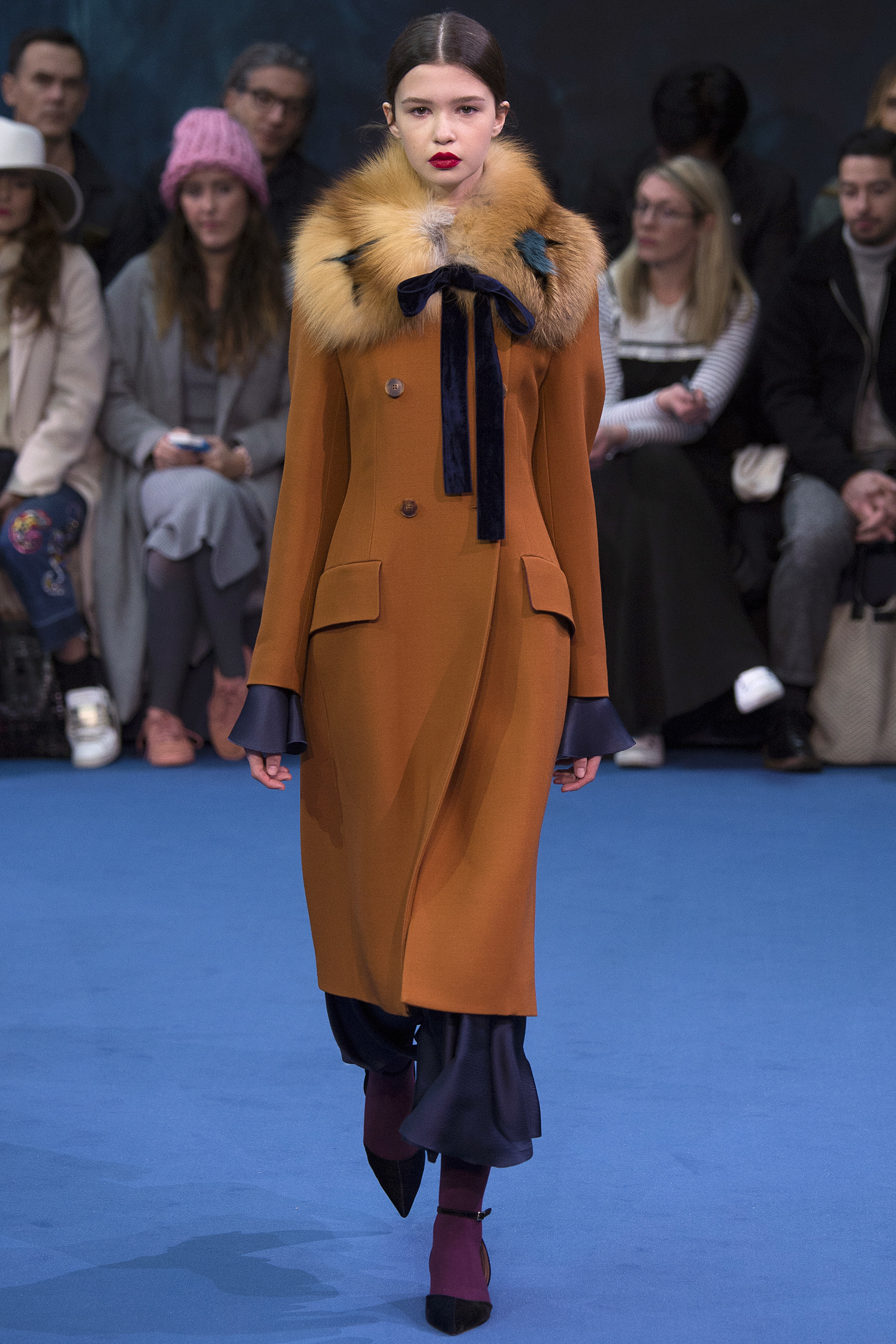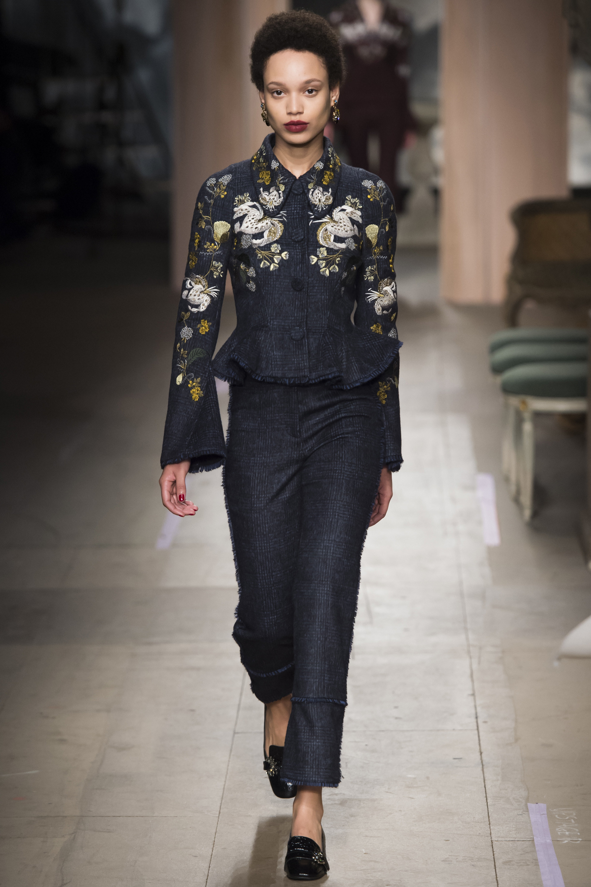 Antonio Berardi gave his audience smart yet sinister eveningwear and every bit of black you could expect to wear this fall. Serbian designer-led brand Roksanda was equal parts prim and proper with a jewel toned collection, replete of magical and charming ruffled collars. Peter Pilotto opted for intricacy over everything in hand-stitched mandarin-collar coats screaming snow queen and diamond-leaf print dresses that skewed Queen of Hearts from Alice in Wonderland .