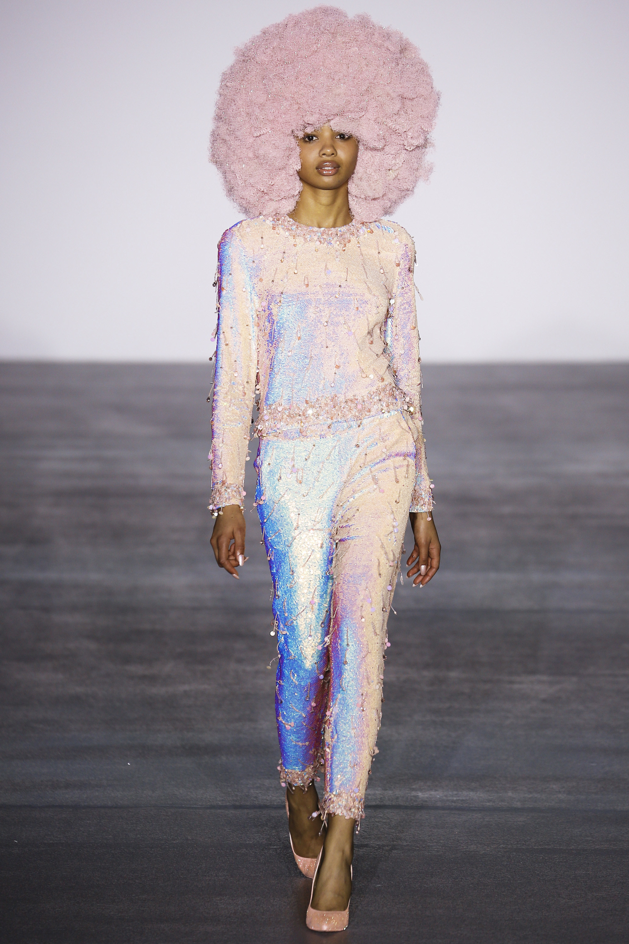 It was a party at Ashish, but who would expect any less from creative director Ashish Gupta? Soft pinks and apricot hues tinged the oversized afros, tops, spaghetti dresses, nails, and even the heels. A box of crayons was the catalyst for the Fall 2016 RTW collection and Gupta’s mission was accomplished as models sported monochrome party dresses down the runway.