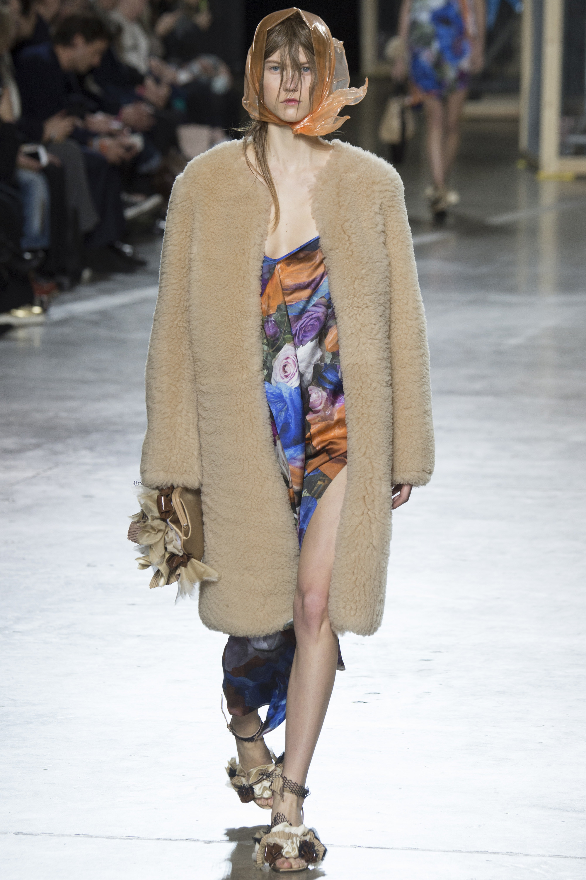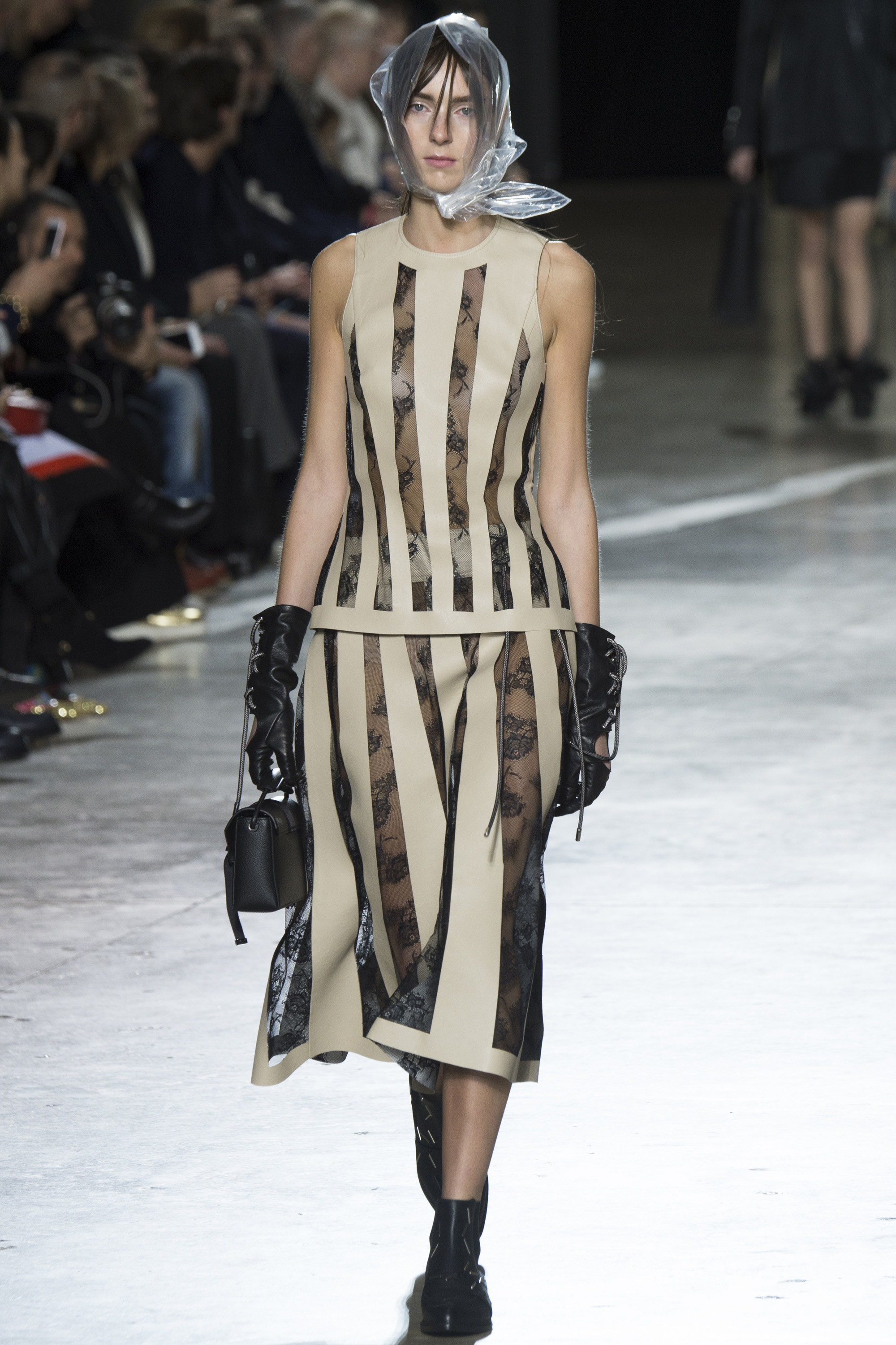 Bag lady took on a whole new meaning at Christopher Kane‘s Fall 2016 RTW show this Monday. The models actually looked wet and cold as they sauntered the runway in plastic rain caps and snug wool coats.