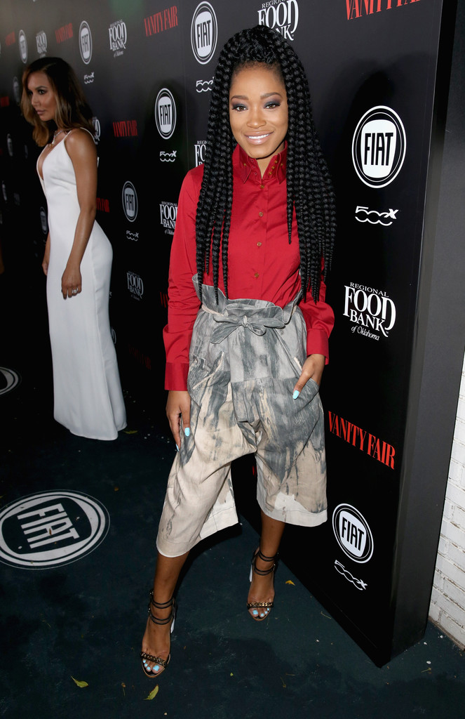 The lady of the moment Keke Palmer stepped out rocking a beautiful red button up under a splatter-patterned culotte bottom both by Vivienne Westwood. She finished the look with some open-toed sandals. Hmm…what do you think?
