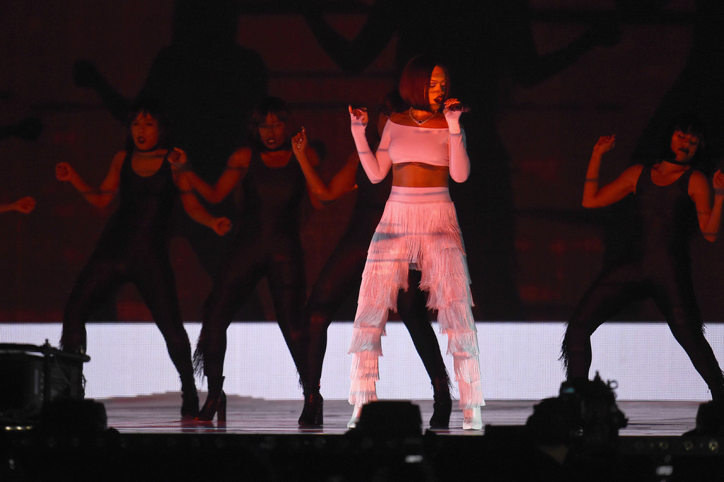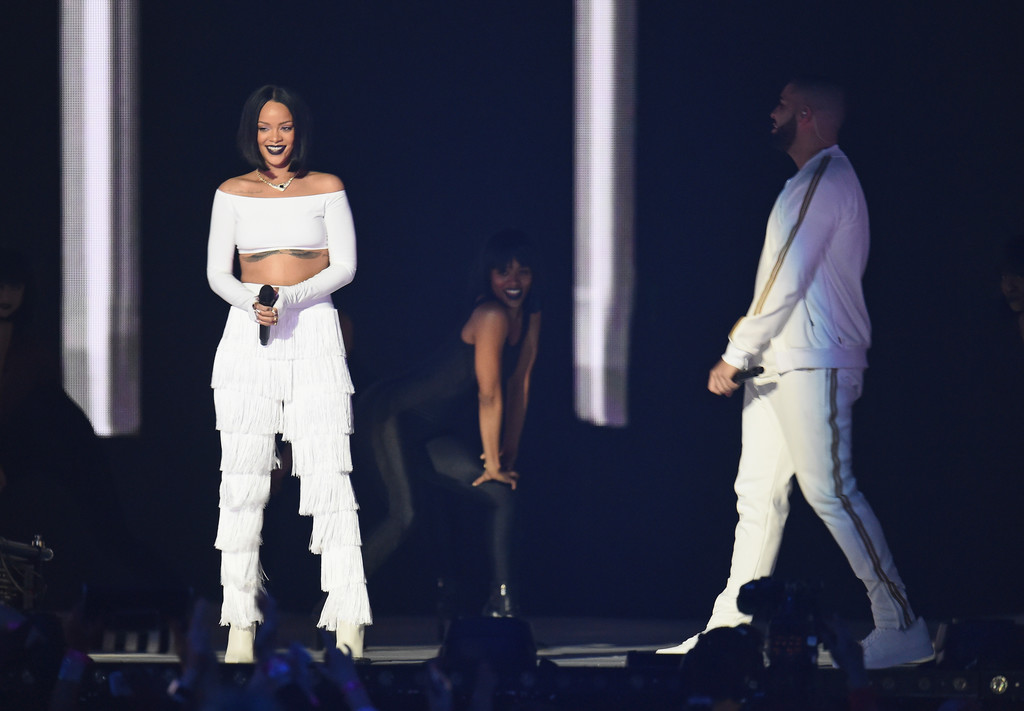 Rihanna hit the stage with SZA and Drake in a white off-the-shoulder crop top and $695 Norma Kamali White Fringe Pants: