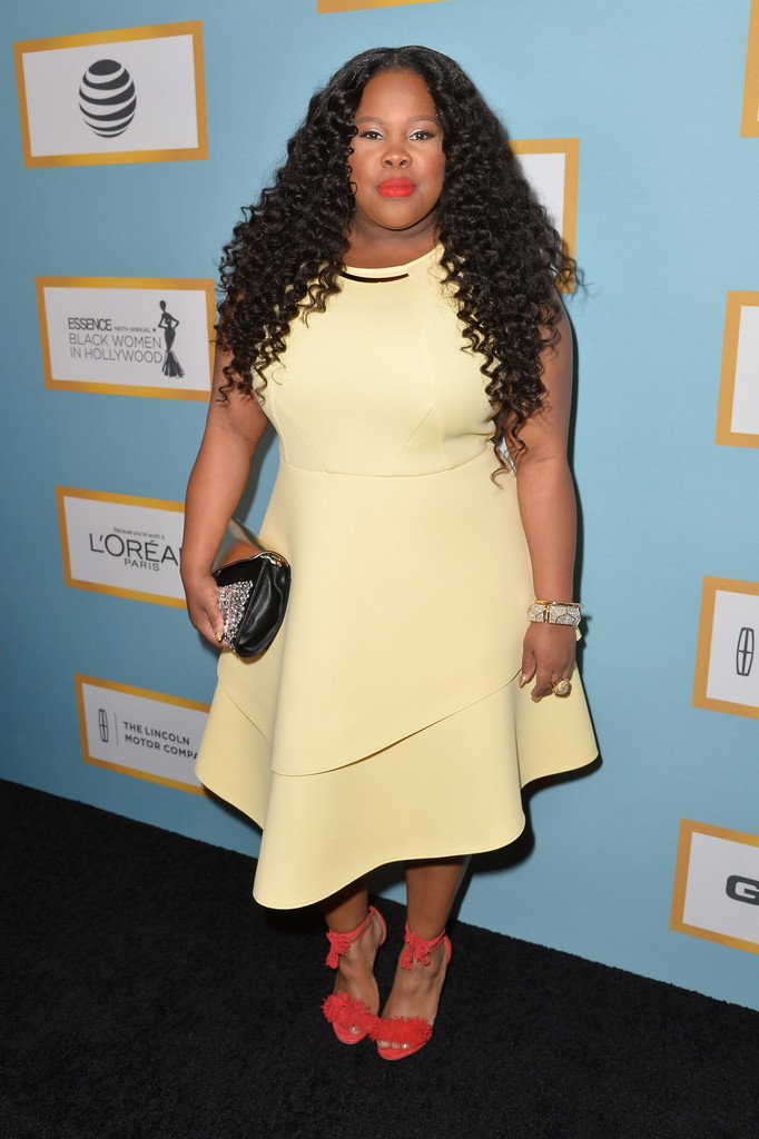 The awesome Amber Riley wore an Eloquii yellow dress with some fuzzy red Altuzarra sandals and matching red lip.